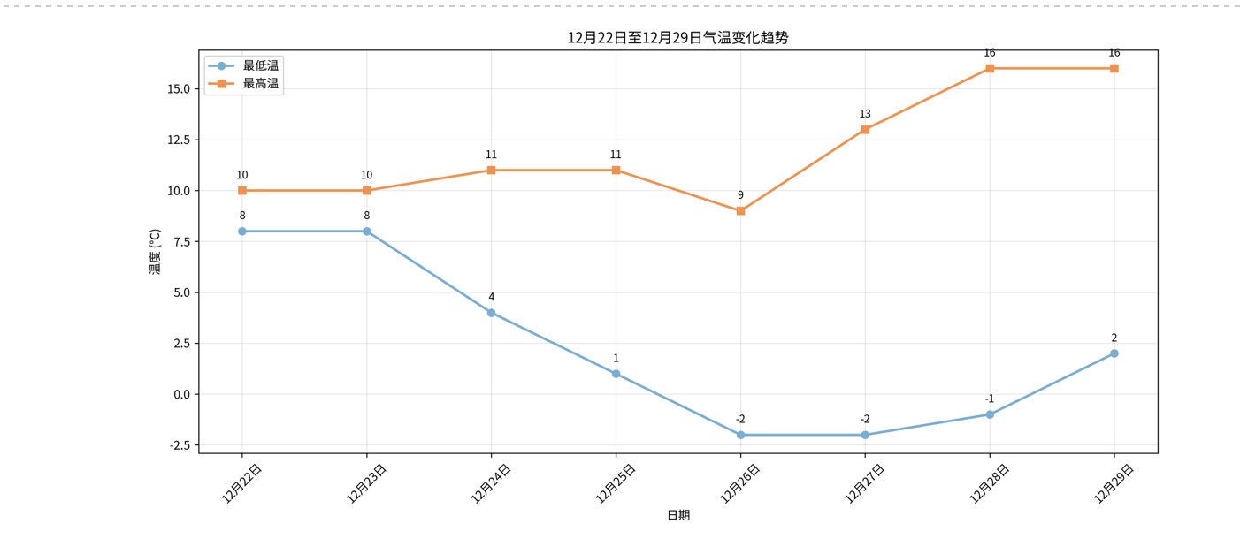 12月29日:多云到阴天,偏北风2到3级,气温2~16℃。