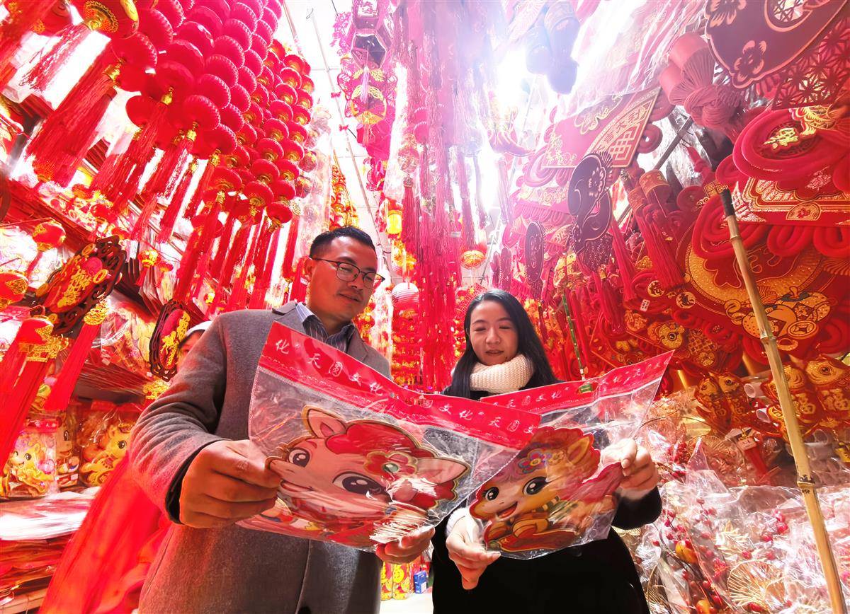 12月22日,随着2025农历丙午马年临近,武汉市汉正街小商品批发市场沿街商铺挂满红灯笼、春联等商品,各类“马到成功”主题挂件、非遗马元素剪纸、卡通马等生肖元素喜庆饰品走俏。据经营20余年的商户刘军华介绍,12月初起,店内迎来一年中最旺销售季,非遗刺绣中国结、电子马形灯笼等爆款日均售千件,卡通骏马挂饰、IP联名红包等新潮款式受年轻人青睐。(湖北日报全媒记者 陈迹 摄)