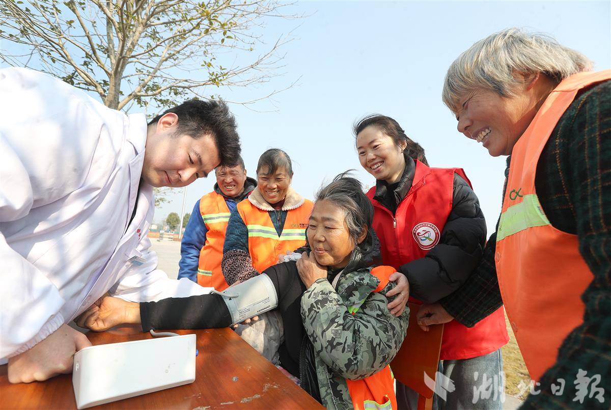 12月17日,荆门市东宝区石桥驿镇石桥驿社区,党员志愿者为环卫工人开展健康义诊,并现场普及冬季健康防护知识。