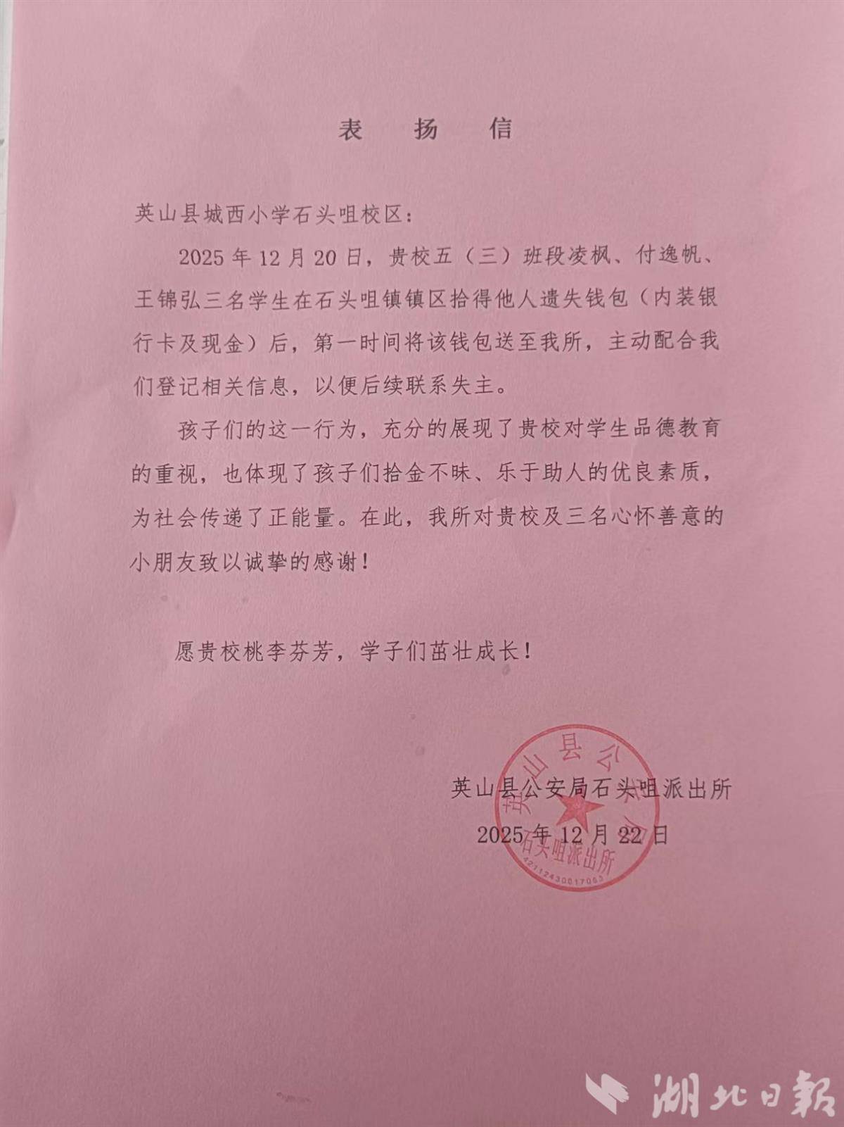 英山3名小学生拾金不昧 民警进校送表扬信