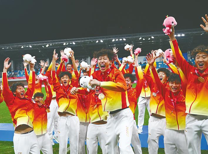 11月12日,十五运会男足U20冠军湖北队在颁奖仪式上庆祝。(新华社发)