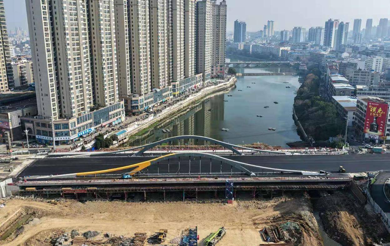枣阳市从2024年10月起,投资9796.61万元,拆除老新华大桥,并在原址建新桥。经过一年多的紧张施工,新大桥主体结构已全面完工,桥面沥青摊铺也全面完成,正在进行大桥南岸接线段沥青摊铺工作。下一步将进行大桥北岸接线段的沥青摊铺、桥梁段的栏杆安装、人行道的铺装和钢拱肋的涂装等工作。