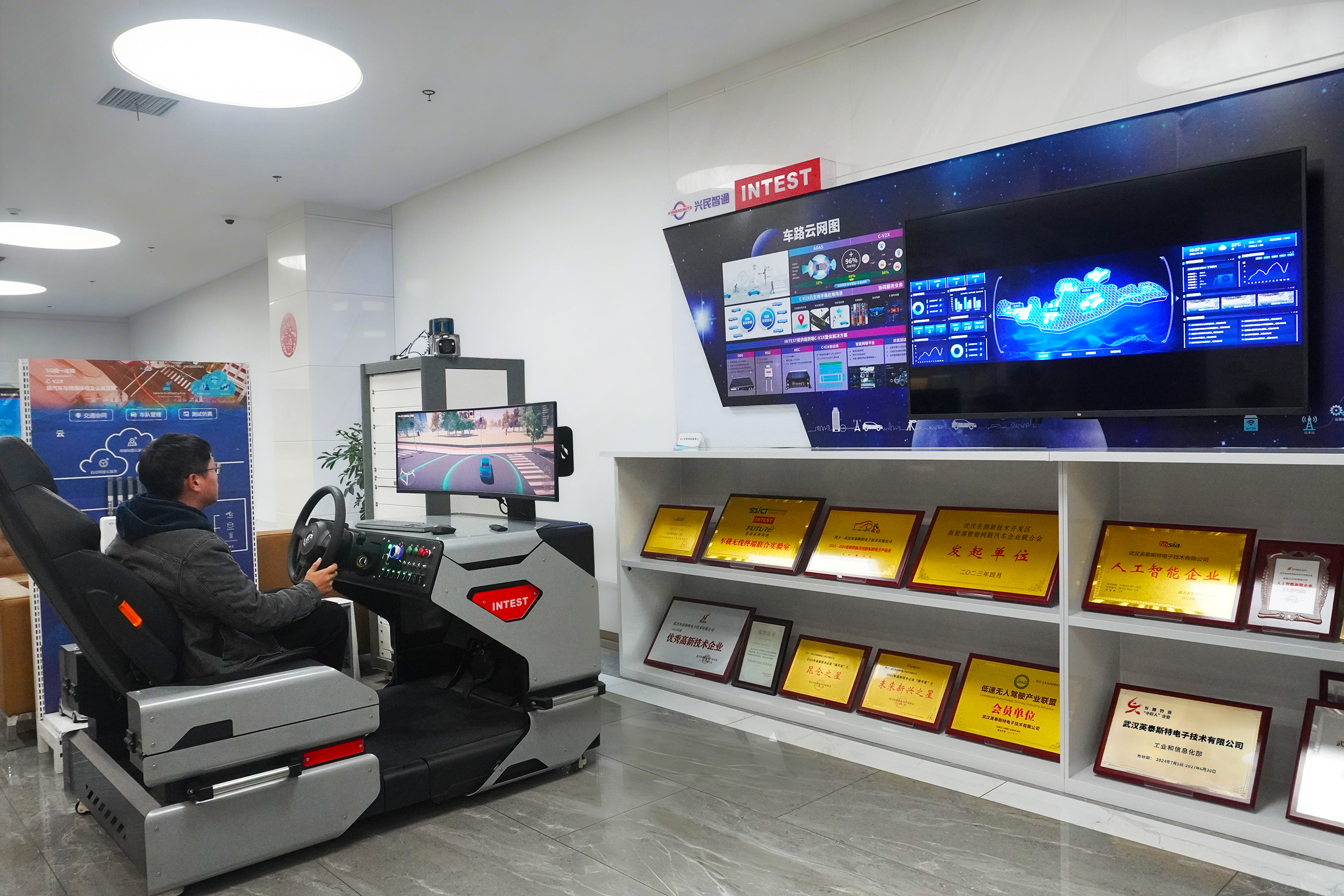 在武汉英泰斯特电子技术有限公司展厅,工程师正在通过模拟驾驶舱反复校验AI大模型等系统。杨廷艳 摄
