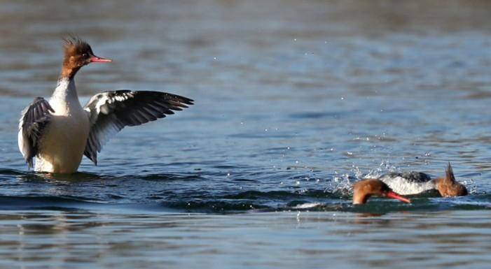 湖北日报客户端讯(通讯员胡娟、何富芝)近日,谷城汉江国家湿地公园迎来珍贵的“明星访客”——国家一级重点保护野生动物、有“水中活化石”和“鸟中大熊猫”之称的中华秋沙鸭。这组珍贵的影像,由本地观鸟爱好者何富芝老师于湿地静谧的浅滩与清澈的水湾中幸运捕捉。
