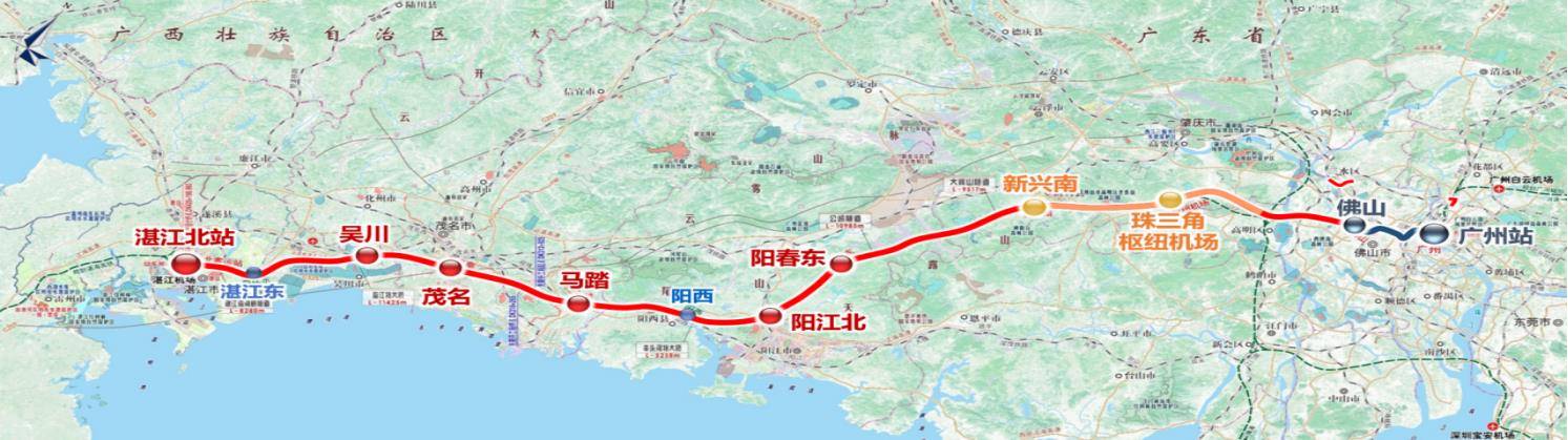 广湛高铁起自广州枢纽广州站,途经广州、佛山、肇庆、云浮、阳江、茂名、湛江等地,终至规划中的湛江北站。该线路的建成运营,将实现粤港澳大湾区与海西经济区、北部湾经济区、海南自贸港的高效连接,进一步发挥粤港澳大湾区的辐射带动功能,对助力广东省“百千万工程”、促进区域协调发展具有重大意义。