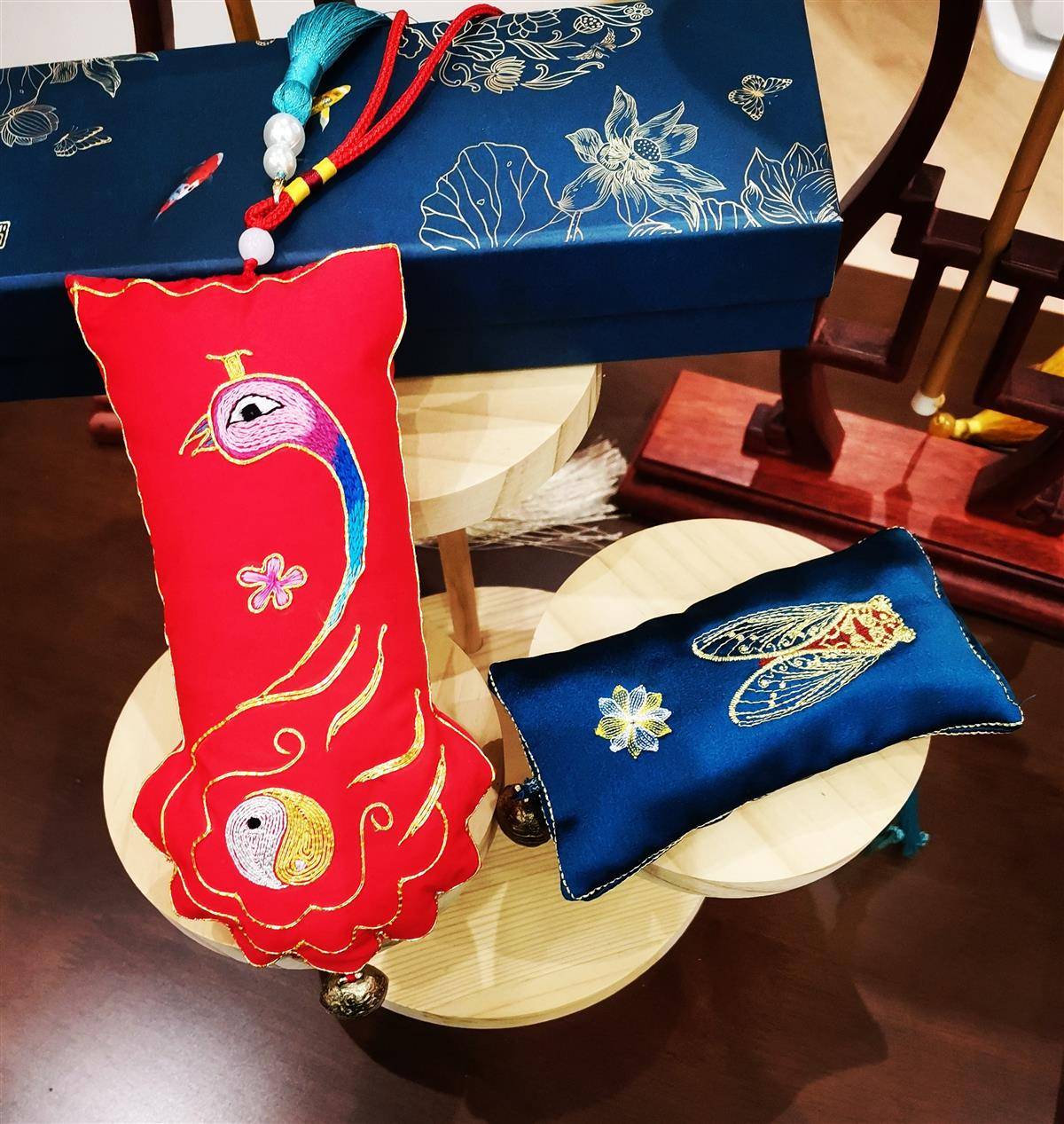 在武汉,汉绣代表性传承人王子怡一直在探索汉绣的当代化路径。她将汉绣浓墨重彩、富丽堂皇的传统风格,与日常生活、家居用品的设计相结合,涌现出不少融合汉绣元素的时尚饰品和实用工艺品。2025年世博会上,汉绣《神鸟枕边香》《金蝉捏捏香》深受各国观众青睐。“非遗要活下来,必须让人用起来”,这已成为众多传承人的共识。