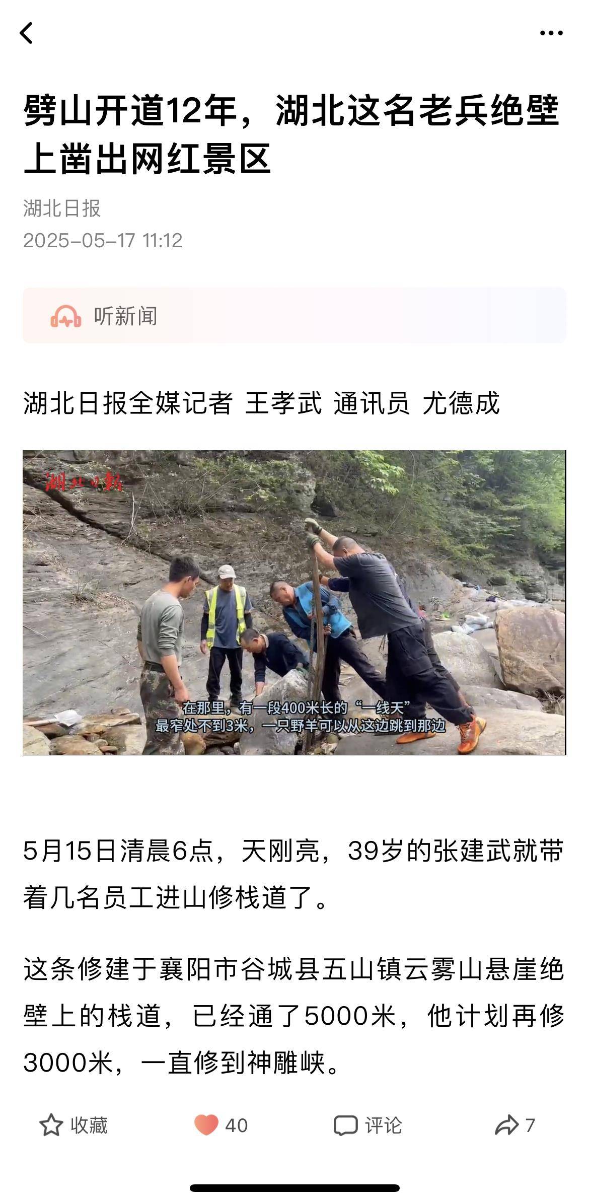 湖北日报讯(记者王孝武 通讯员王海青)劈山开道12年,在绝壁上凿出网红景区的湖北省襄阳市谷城县退役军人张建武的故事,近日被拍摄成29集微短剧《班河谣》,在全网发布上线,引发广泛关注。