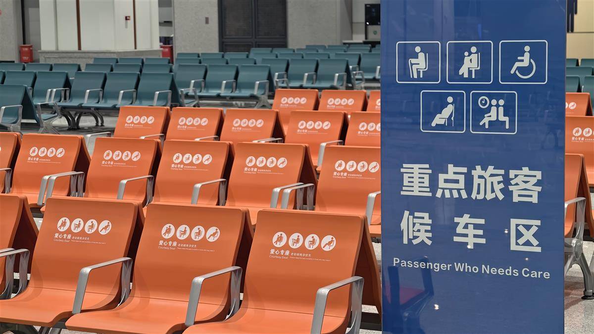 这种“公交化”的运行节奏,并非唯一亮点。走进沿线新建车站,处处可见人性化设计的巧思——候车厅内,明橙色的爱心专座格外醒目,座椅上清晰印有“爱心专座”字样及老弱病残孕标识,温暖而不失格调。车站内部通透明亮,装修简洁现代,指引十分清晰。