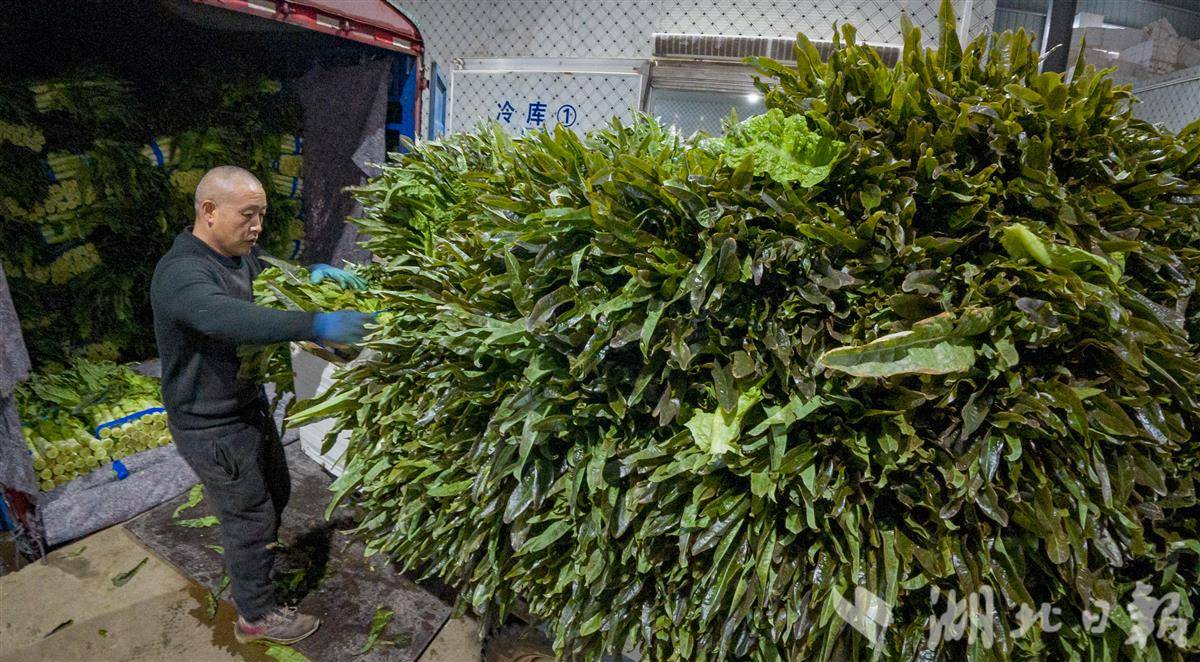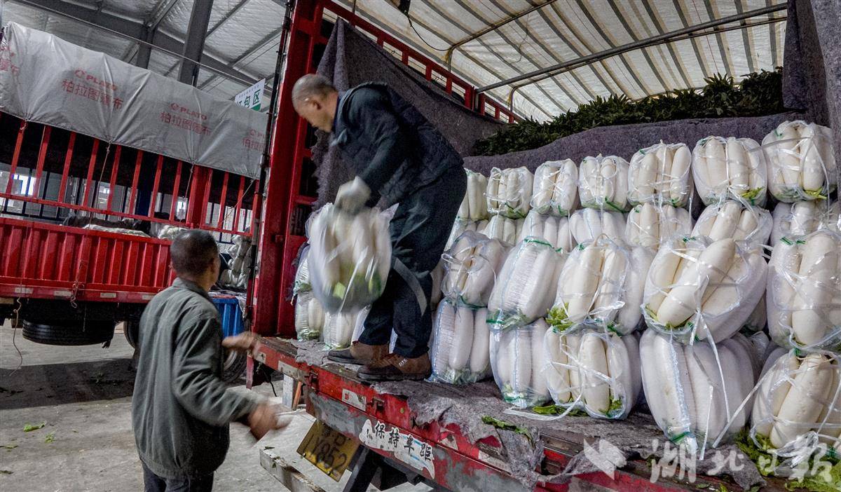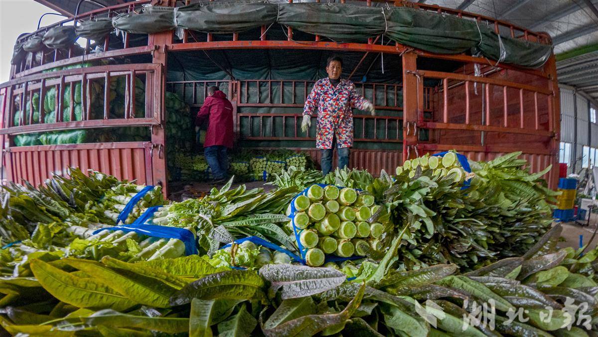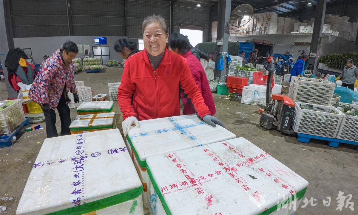 12月23日,在荆州区李埠镇旭东蔬菜产销专业合作社,工人们正有序分拣、打包萝卜、莴苣、西兰花等时令蔬菜,这批近50吨的蔬菜即将通过冷链物流发往湖南、江西等地。