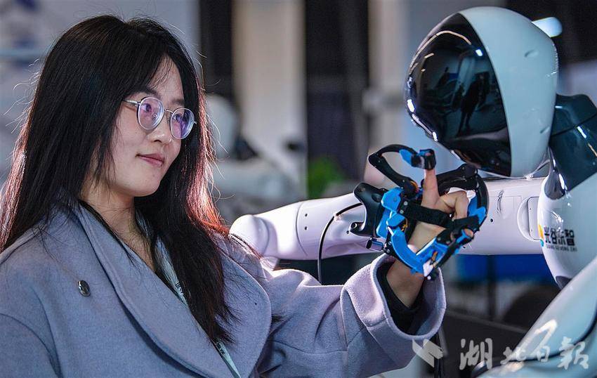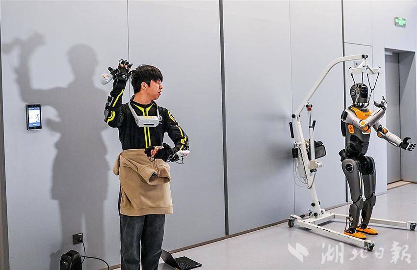 12月24日,湖北人形机器人创新中心,机器人训练师戴着外骨骼手套在工作。