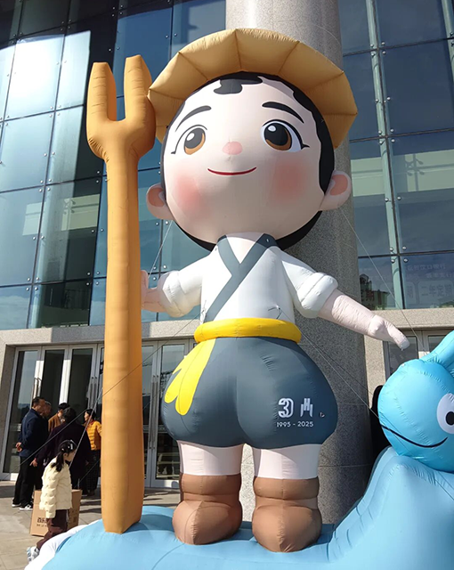 这尊卡通“福娃”面色红润,浓眉大眼,头戴斗笠,身着汉服,脚穿雨靴,踏波迎浪,手握“耒耜”治水工具,目视前方,炯炯有神,活生生的大禹传人形象,人们亲切称之为“江小禹”。
