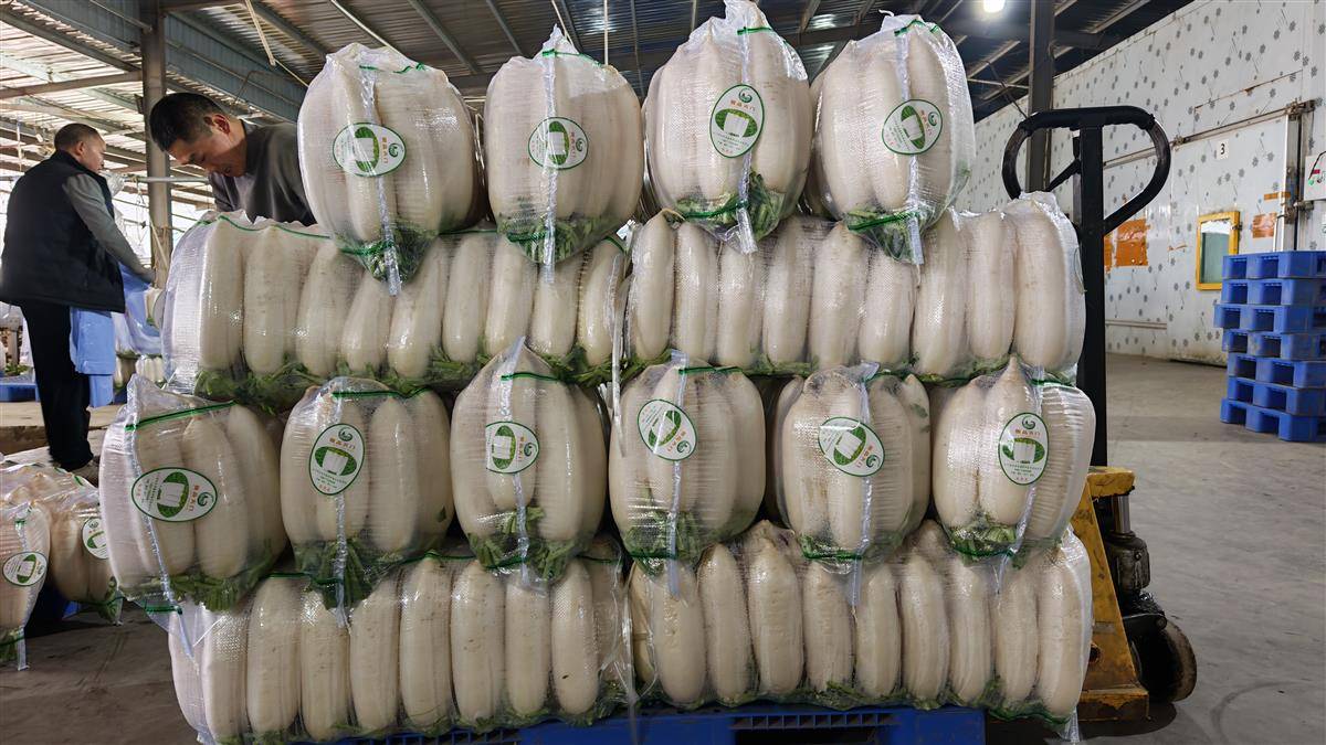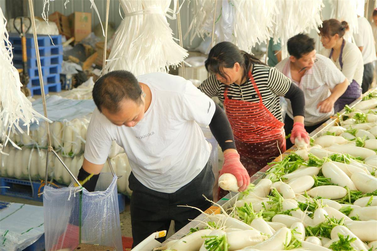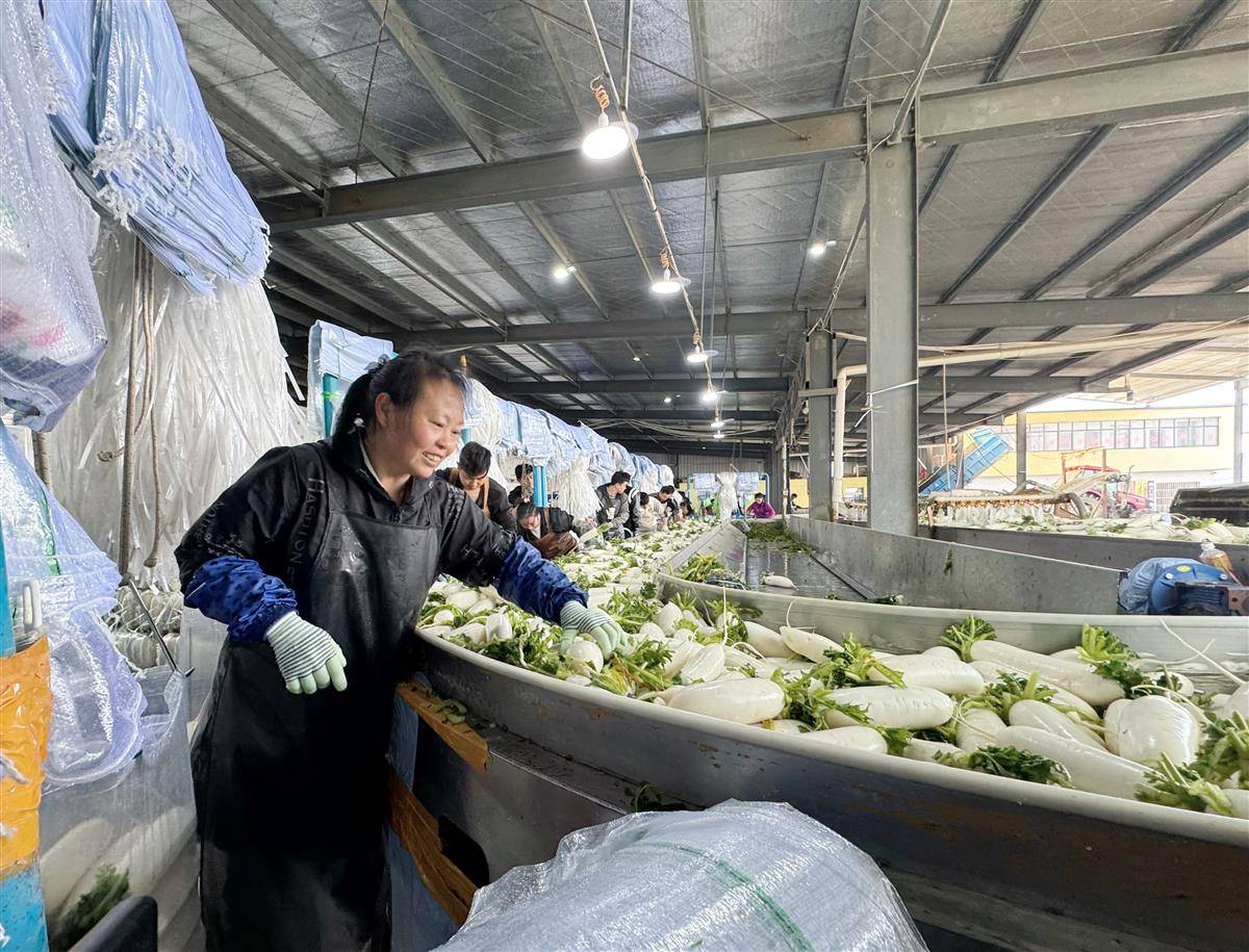 走进鑫隆合作社,3条萝卜清洗流水线火力全开,40余名工人正熟练地对萝卜进行分拣、清洗、包装。合作社负责人谭军耀表示:“今年种植了2100多亩白萝卜,得益于标准化的管理,亩产达到1万斤,销售期可持续到来年2月。”