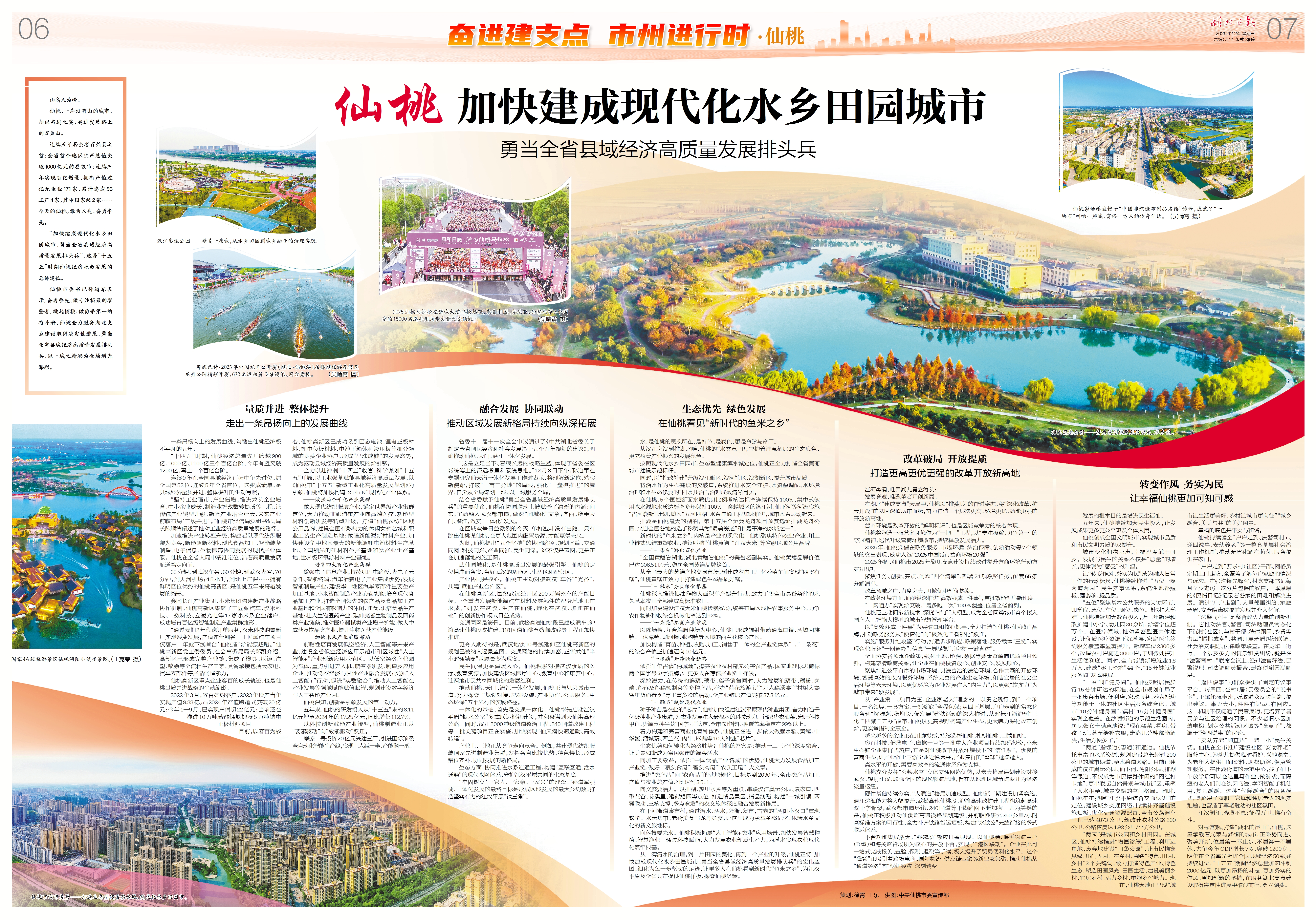 从一湾清水的治理,到一片田园的美化,再到一个产业的升级,仙桃正将“加快建成现代化水乡田园城市、勇当全省县域经济高质量发展排头兵”的宏伟蓝图,细化为每一步坚实的足迹,让更多人在仙桃看到新时代“鱼米之乡”,为江汉平原及全省县市提供仙桃样板、探索仙桃经验。