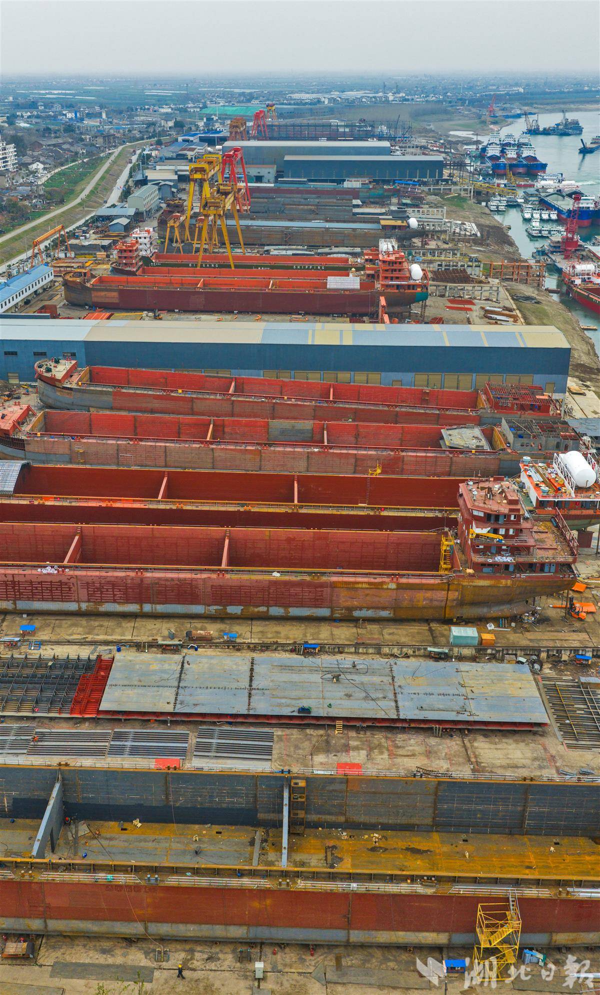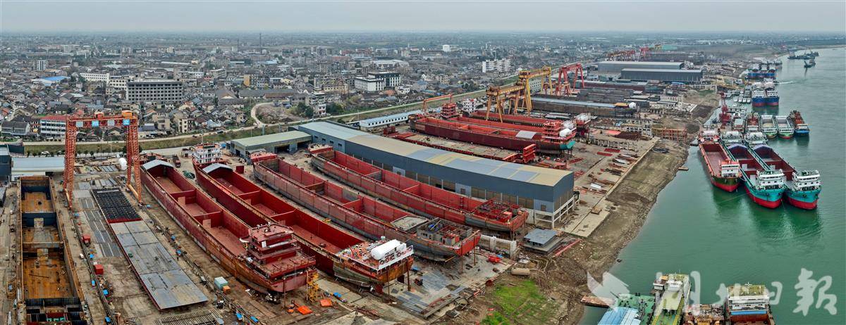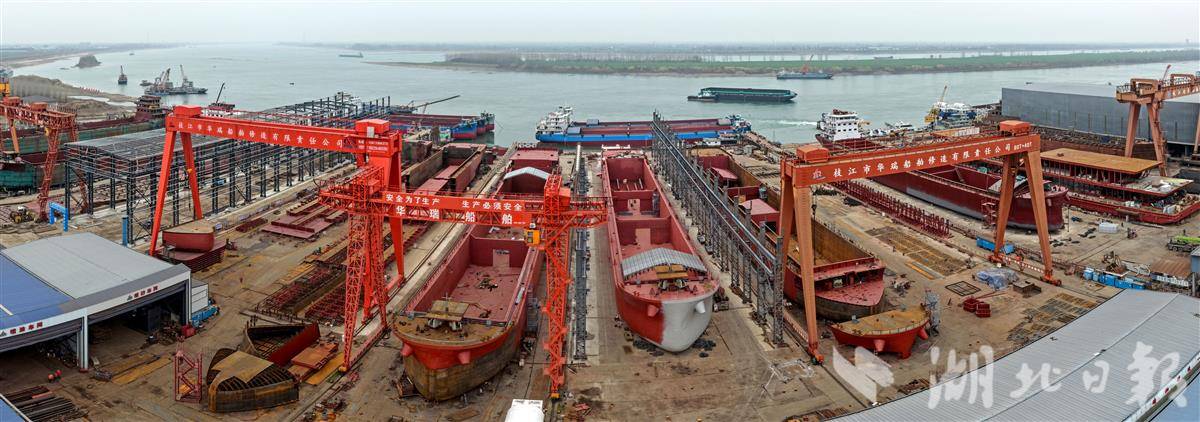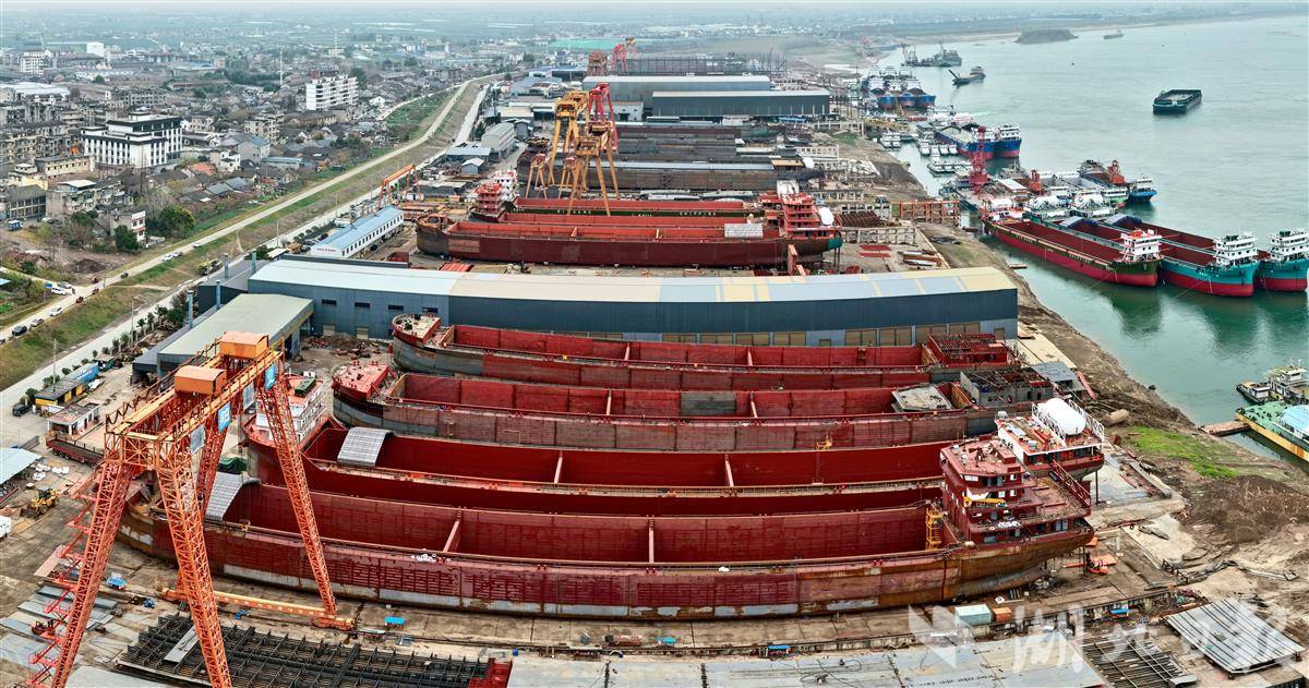 12月24日,位于枝江的宜昌船舶工业园沿长江岸线绵延铺展,一派繁忙有序的生产景象。空中俯瞰,密集的龙门吊如钢铁巨人般矗立,多艘万吨级船舶在船台上同步建造、轮廓初现,电焊弧光不时闪烁,与江面波光交相辉映,壮观而充满活力。