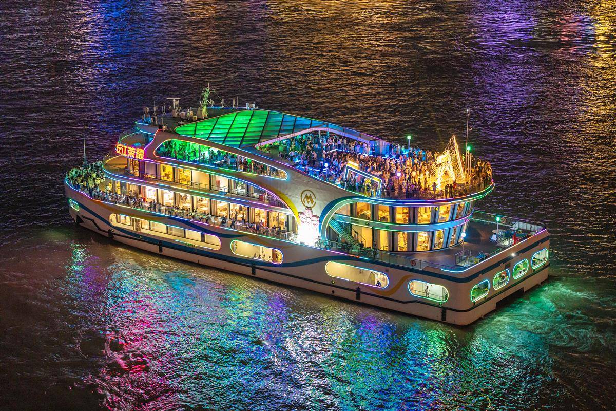 夜色下,“长江荣耀”号流光溢彩,成为长江武汉段的一道亮丽风景。