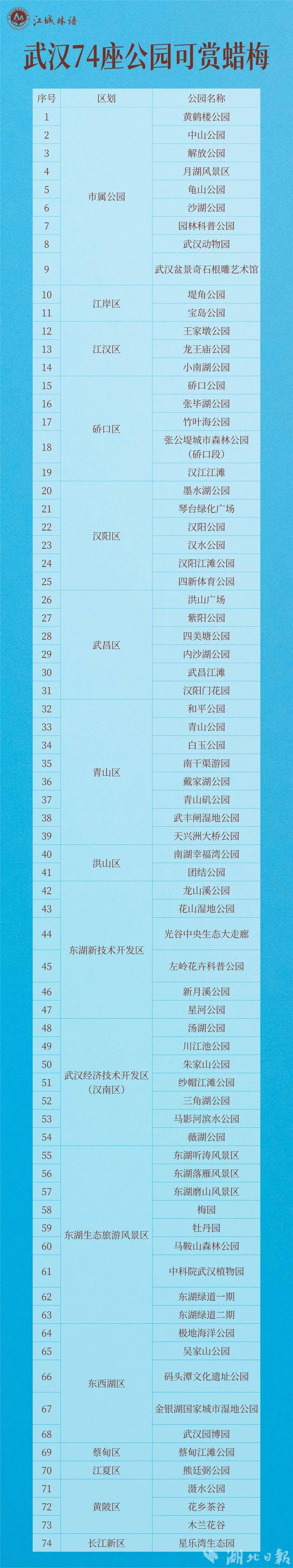 目前,解放公园、青山公园、紫阳公园、黄鹤楼公园、中山公园等地蜡梅均已陆续开放。青山公园更在初绽的蜡梅林旁开设“自然研学课堂”,结合园内金钟梅、磬口梅等7个品种,打造了一座“活态蜡梅科普馆”。