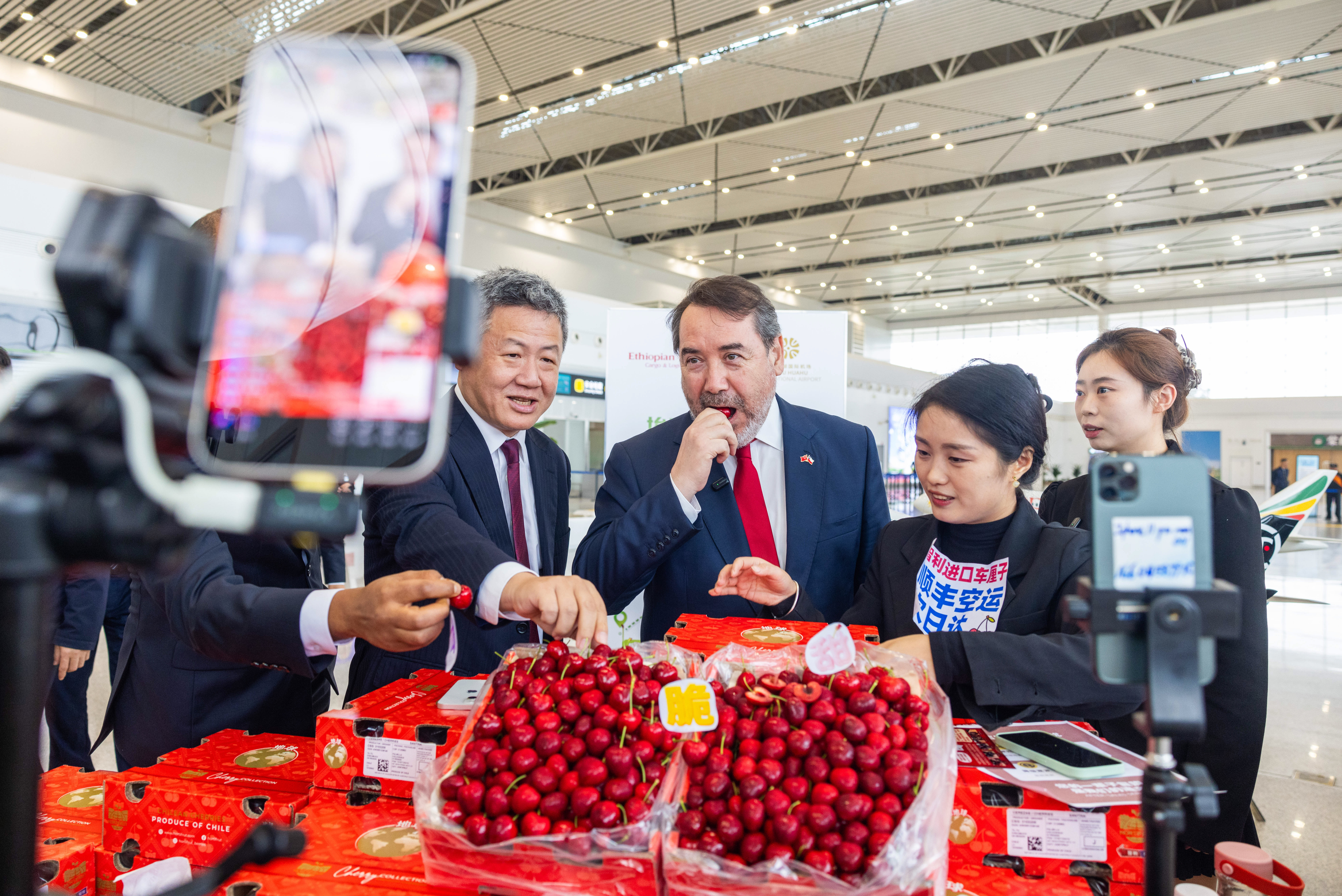 2025年11月7日,智利驻华大使巴勃罗·阿里亚兰(右三)走进花湖国际机场车厘子直播间,向网友推介智利车厘子。(湖北日报全媒记者 薛婷 通讯员 刘小进 王星予 摄)