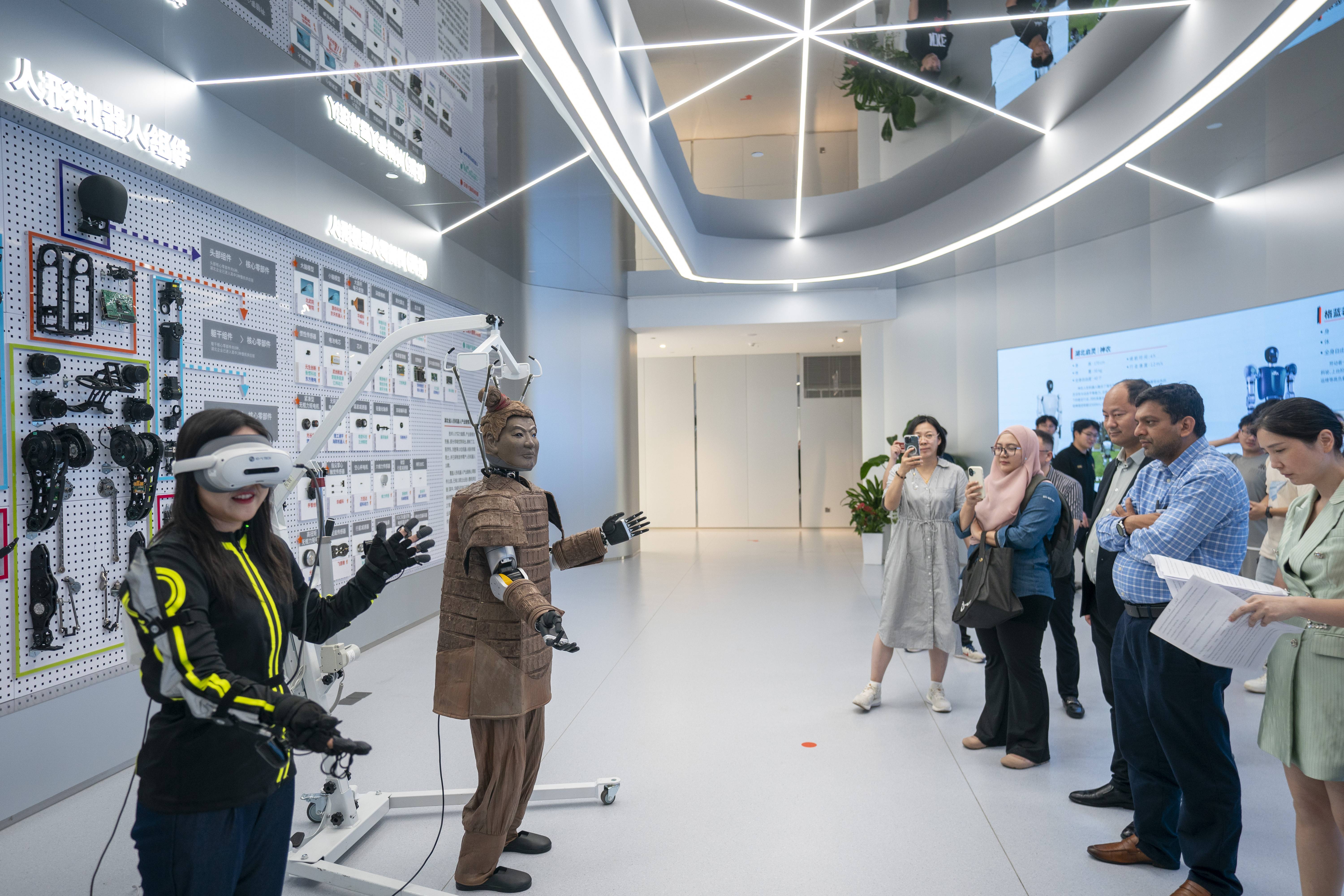 湖北人形机器人创新中心,光谷东智的“光子”人形机器人跟着动捕演员训练舞蹈动作。(湖北日报全媒记者 魏铼 摄)