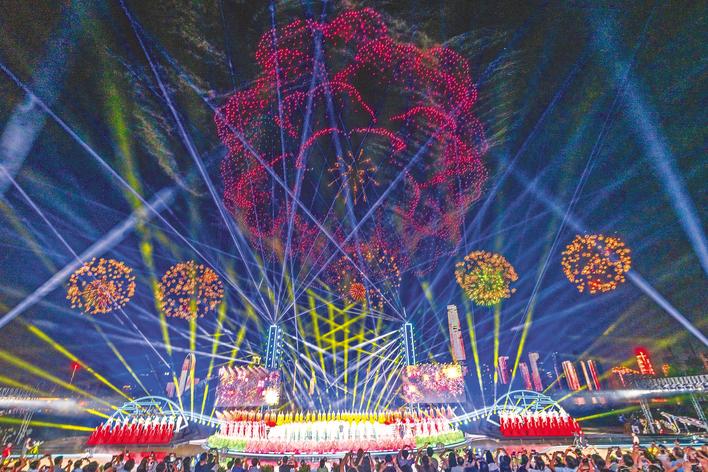 9月11日晚,4000架无人机闪耀长江夜空,与舞台演出、江面焰火联动,呈现“江豚逐浪”“花开中华”等震撼画面。(湖北日报全媒记者 薛婷 摄)