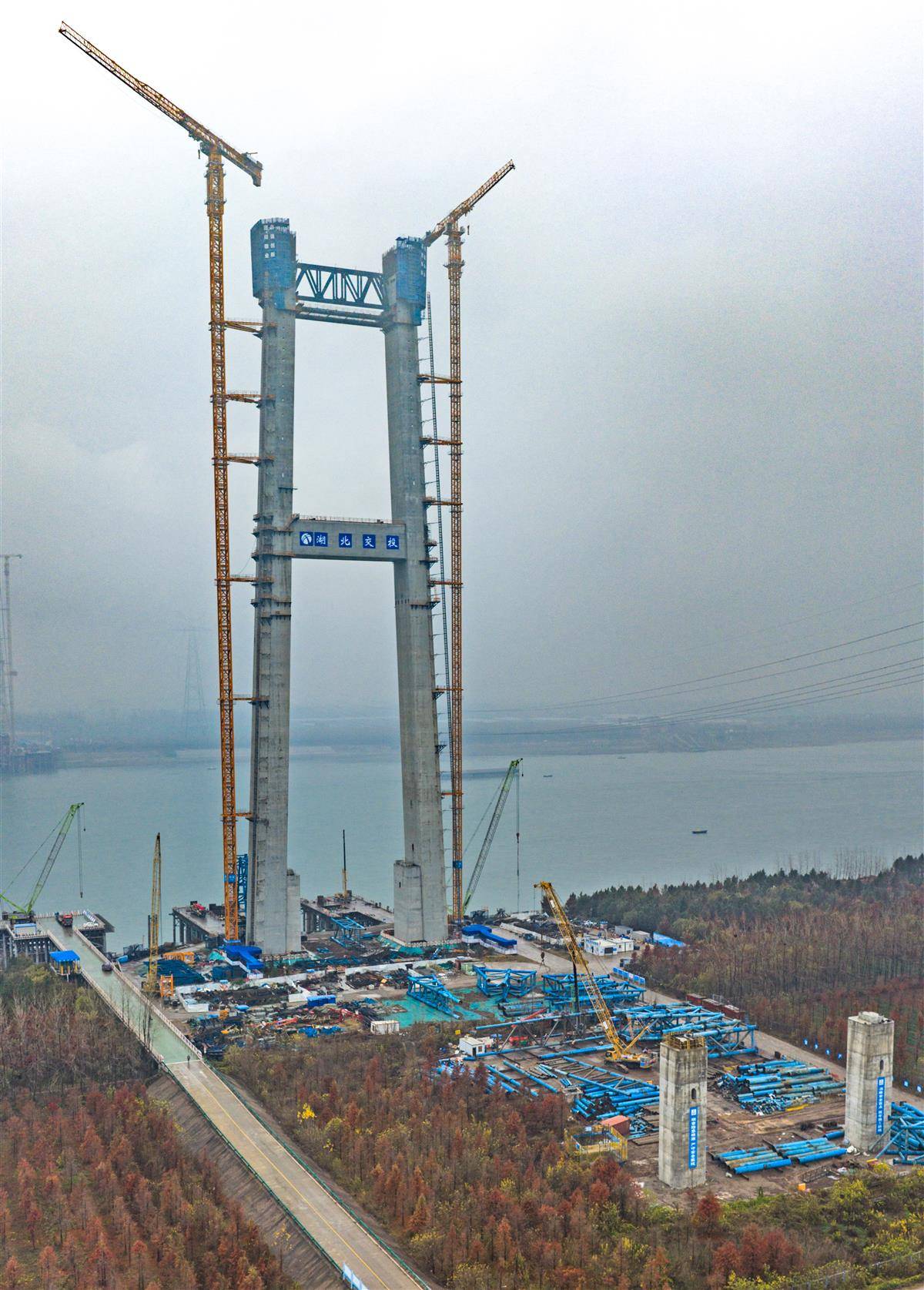 荆州李埠长江公铁大桥项目施工现场一片繁忙,他们正朝着2026年春节前主塔封顶冲刺。
