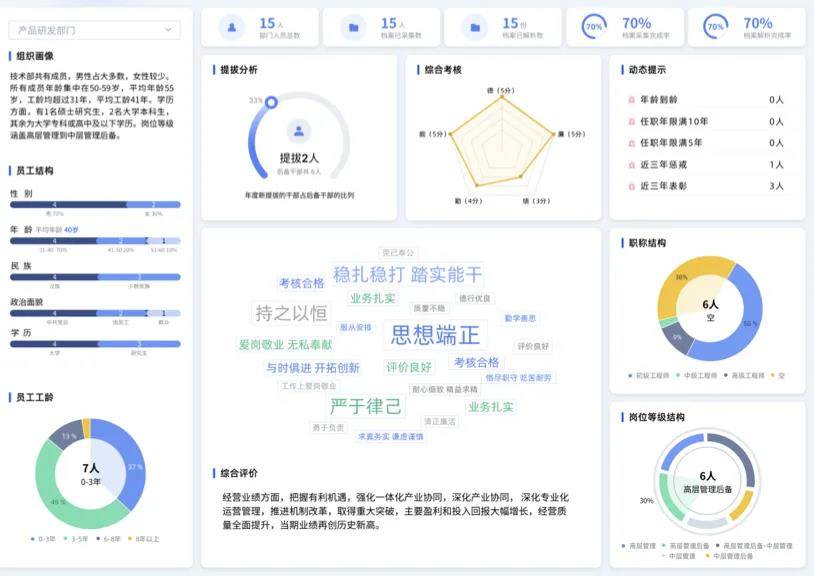 例如,在智能生成干部画像方面,系统可基于干部档案中的履历、考核、学习等多维度信息,通过智能数据分析,自动生成兼具专业性、可读性的综合分析报告,精准提炼干部核心特质,为组织评价提供立体化依据。