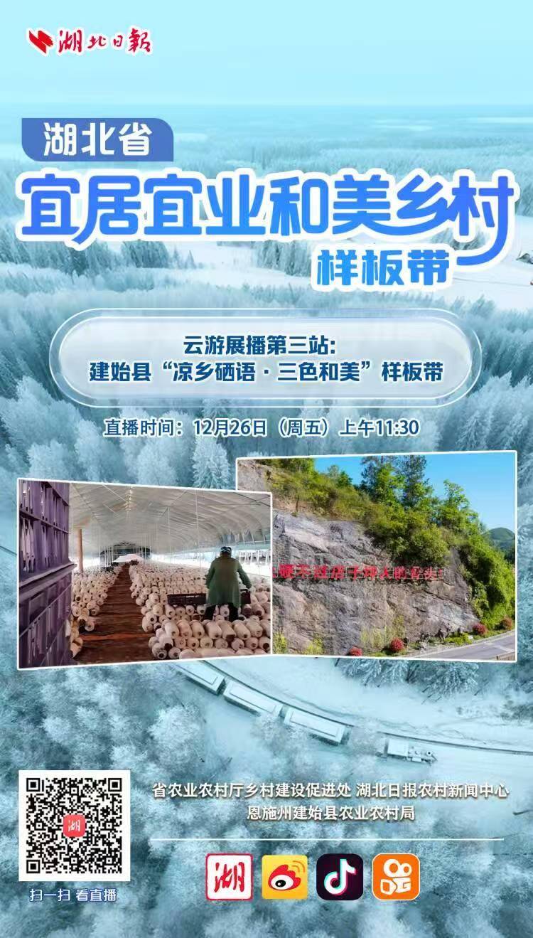 12月26日上午11:30,湖北省宜居宜业和美乡村样板带云游直播第三站镜头对准建始县龙坪乡“凉乡硒语·三色和美”样板带。