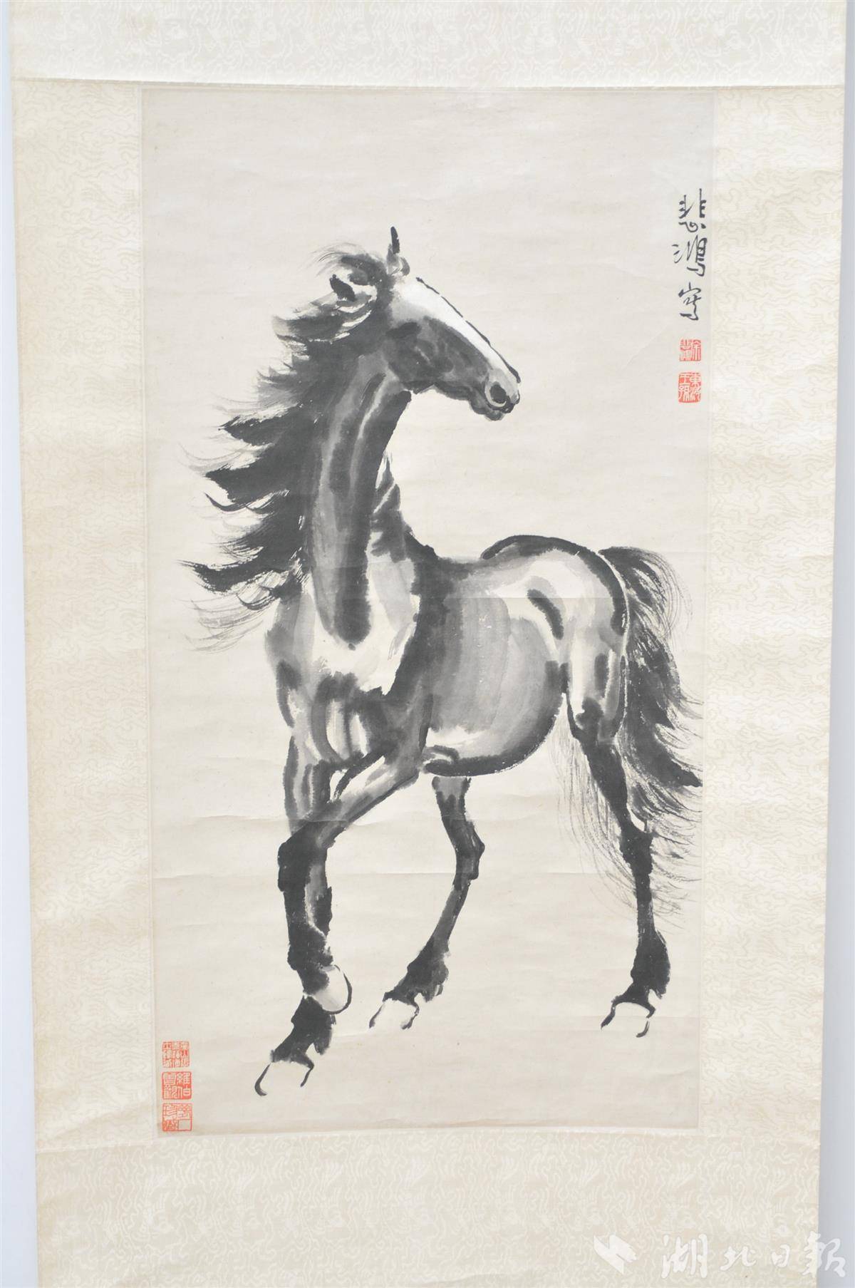 武汉博物馆藏徐悲鸿《马图》轴,以饱酣奔放的笔墨定格骏马神韵,浓淡干湿的变化浑然天成,富有动感。马腿笔法延续徐悲鸿画马的一贯风格,细劲有力,犹如钢刀,力透纸背,既捕捉了马的强健与活力,更传递出一种不屈不挠、勇往直前的精神。