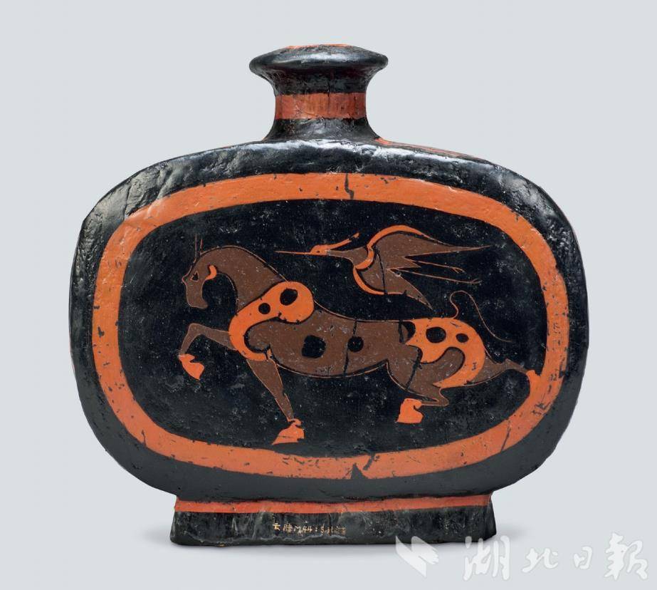 出土于云梦睡虎地44号墓的秦代彩绘牛马鸟纹漆扁壶,是仿铜漆器的代表作。通体髹黑漆,以红、褐漆彩绘,一面绘立牛,一面绘奔马与飞鸟,借鸟翔烘托马驰之态。有专家推测,此壶为酒器,是墓主人远行时随身携带的珍爱之物。