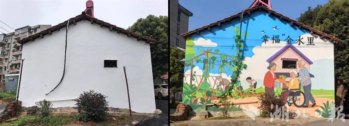 “艺术介入乡村,核心是要让壁画成为土地的‘自述者’,讲述只有这片水土才能孕育出的故事。我们的创作,是对乡土资源的视觉转译与情感升华。”谈及创作理念,项目负责人、湖北美术学院壁画系主任孙谋说。在艾岭村,师生们在湖北美术学院绘画学院的统一策划与安排下,开展了扎实的田野采风。他们走访养殖户,观察小龙虾与桂鱼的生态习性,感受丰收的喜悦;与村民深入交流,紧扣当地特色渔业与“岭家小爱”党建品牌创作主题墙绘,再现金口昔日码头的繁华与鲜活的民俗场景,细腻呈现群众美好生活图景。在金水社区,团队围绕“互助养老”主题,结合社区老龄化特点,于社区老年大学等公共空间创作系列墙绘。作品生动呈现互助养老、和谐生活的场景,使原本单调的墙面转变为承载人文关怀的“幸福金水里”,为老旧社区注入艺术温度与文化活力。