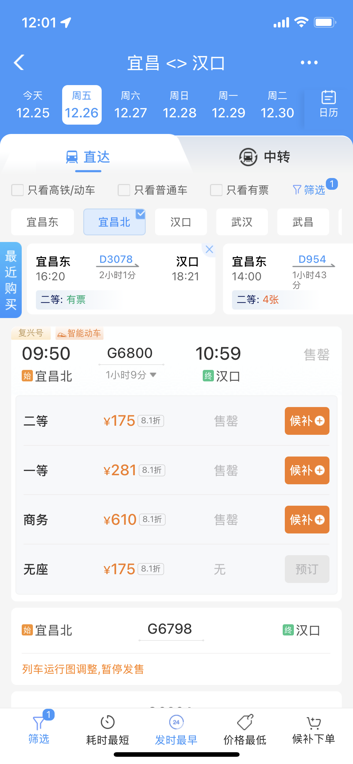 12月25日,记者登录12306网站发现,宜昌北到汉口的高铁票价已出炉。12306显示,当天直达列车G6800票价均有8.1折优惠,二等座(含无座)售价175元,一等座售价281元,商务座售价610元,车程为1小时9分。(湖北日报全媒记者 文凯)