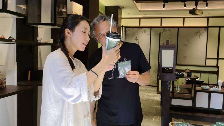 雷寒峰向巴西游客介绍青砖奶茶包装上的万里茶道文化。(受访人提供)