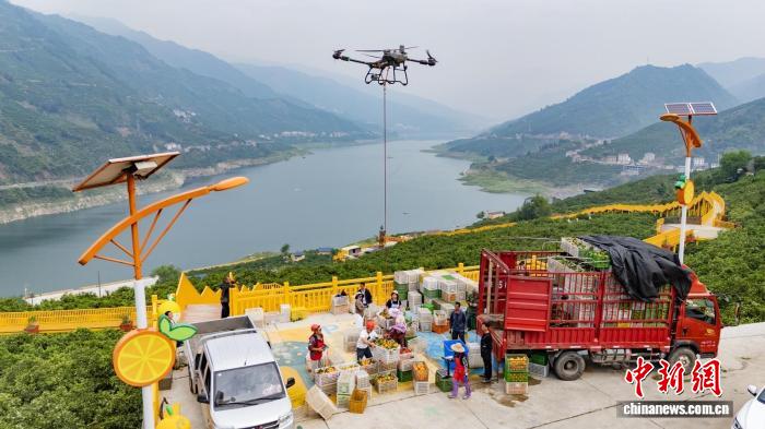 秭归橙农用无人机转运伦晚脐橙。彭强 摄