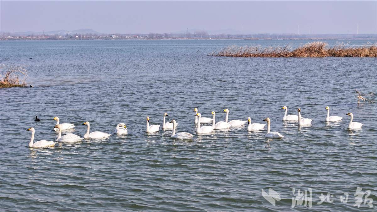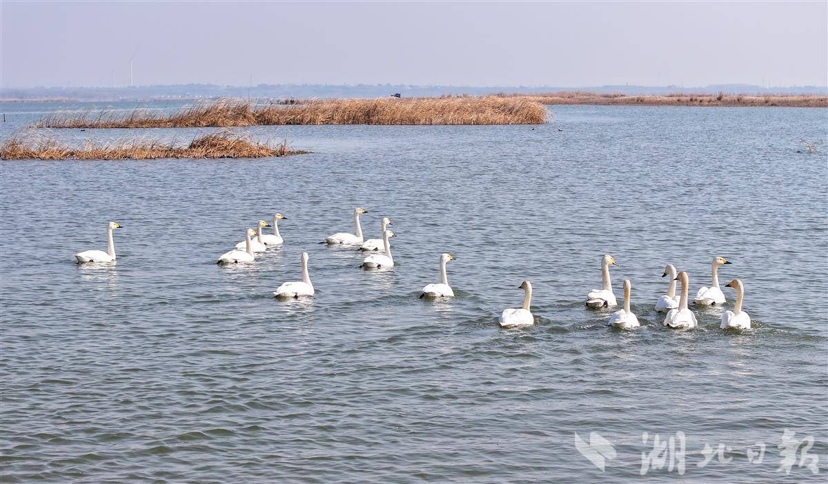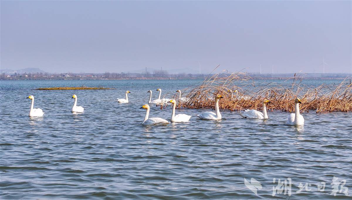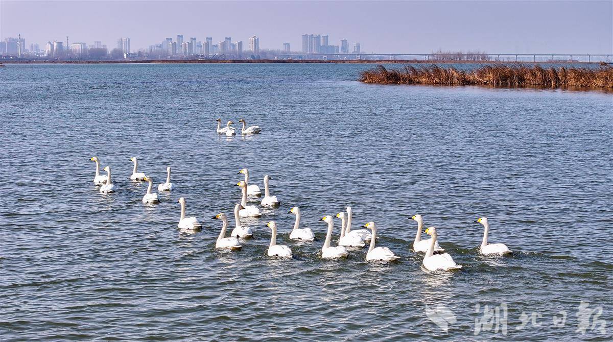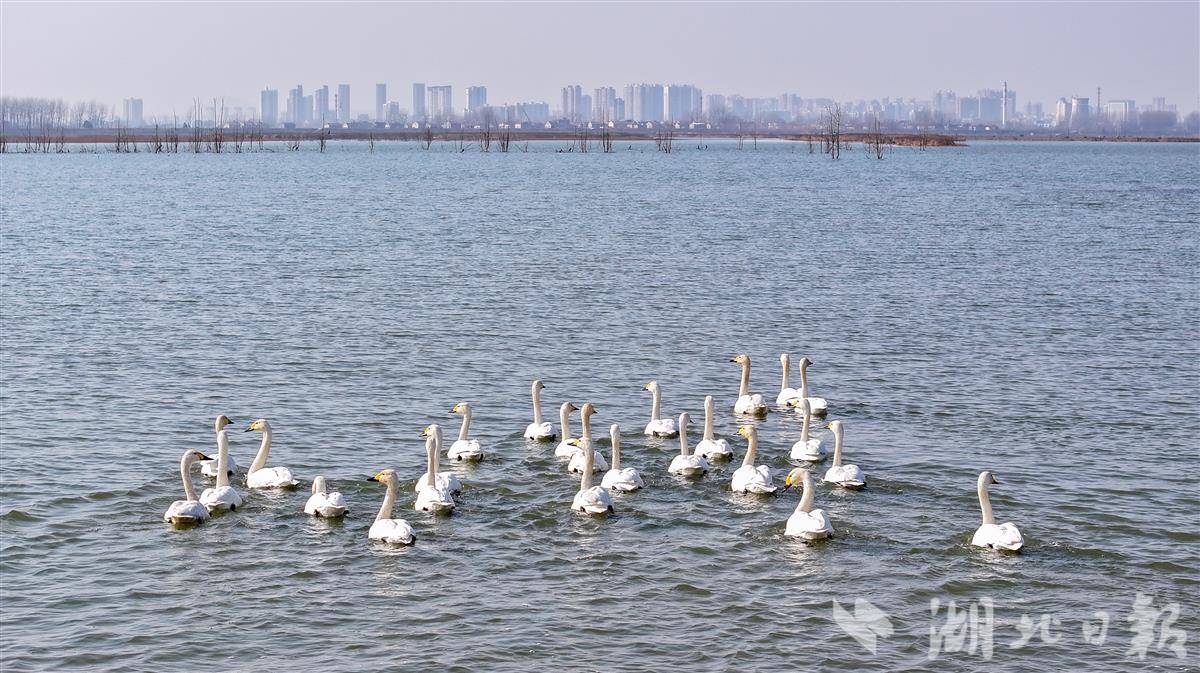 12月25日,一群天鹅正在宜城市万洋洲国家湿地公园嬉戏、觅食。