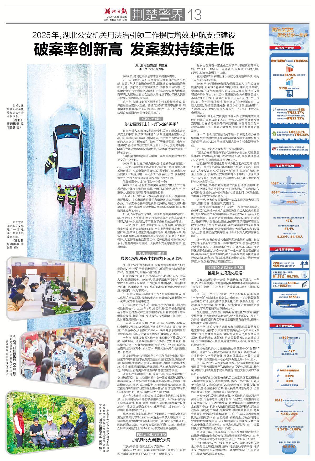 这一年,湖北公安机关用法治引领工作提质增效,纵深推进民生案件大会战。传统“盗抢骗”破案率创新高,刑事案件发案量达近11年来新低。湖北“一市一台”改革做法获公安部面向全国公安系统推广。