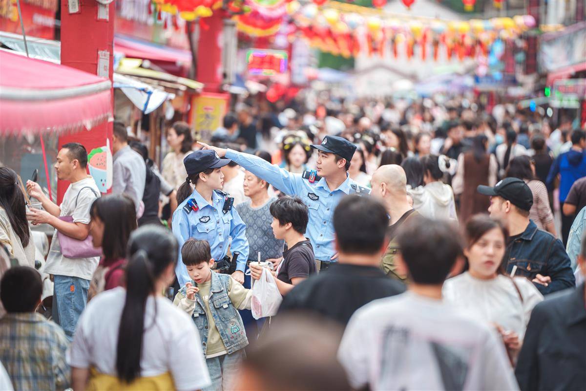 国庆期间,荆州市公安局沙市区分局民警在大赛巷小吃街巡逻。(湖北日报通讯员 关小羽 摄)