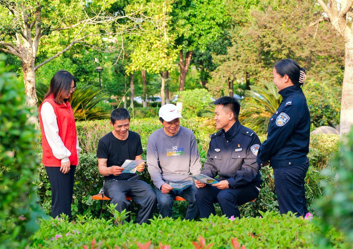 孝感市公安局高新分局城东派出所社区民警与居民围坐交流答疑,并发放宣传手册。(湖北日报通讯员 黄蓓 摄)