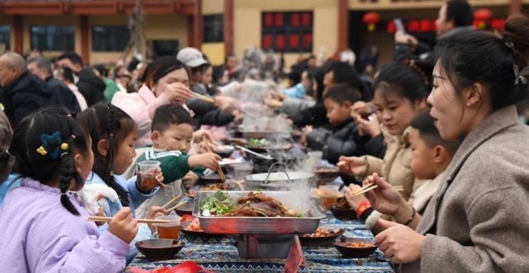 长桌宴在正午开席,数十米长的桌子旁坐满了人。新鲜猪肉烹制的菜肴热气腾腾,土家姑娘唱着敬酒歌,将“高山流水”般的米酒倒入客人口中。寨子里,打糍粑的撞击声、烫豆皮的滋滋声、傩面舞的鼓点声交织在一起。