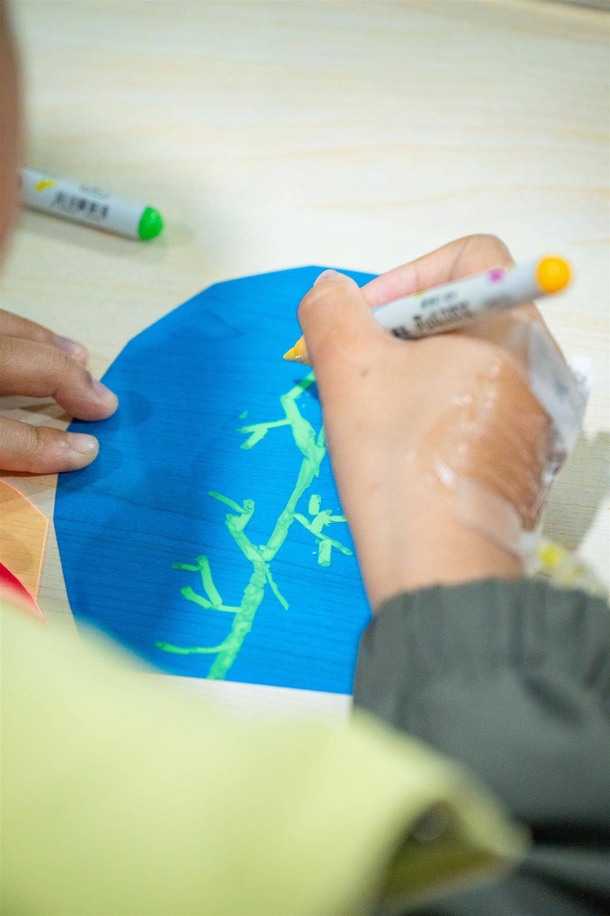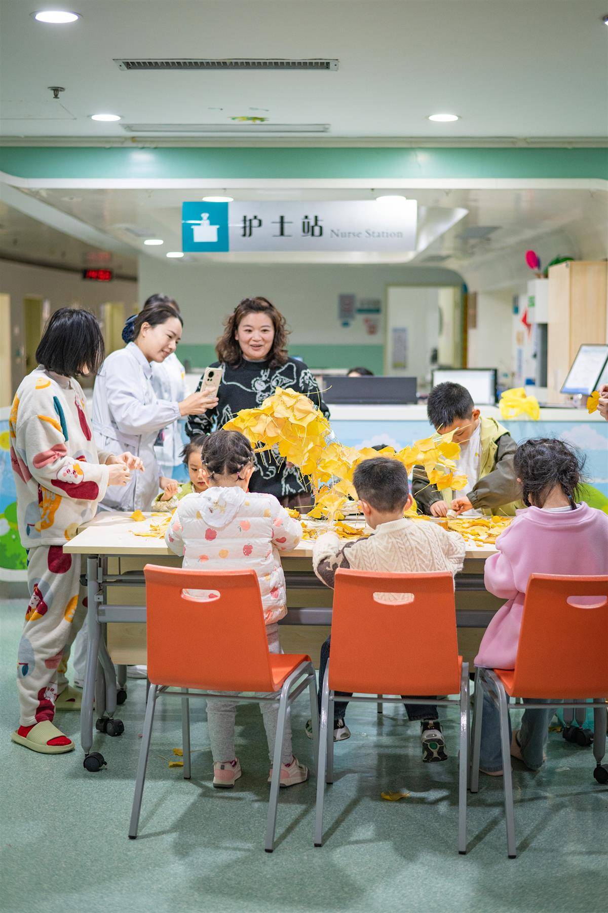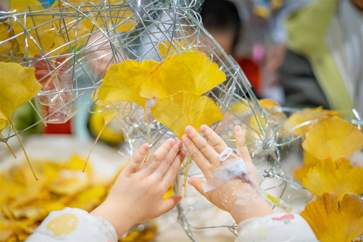 手上有留置针的孩子在认真粘贴银杏叶(武汉美术馆供图)