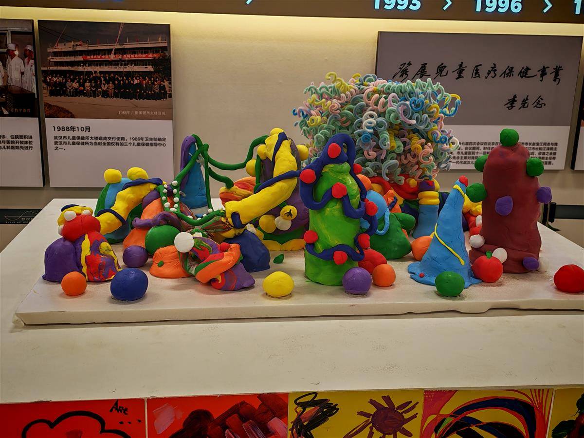 《万物共生》是一件小型装置作品,由康复科患儿共同完成。泡沫、黏土、彩纸、颜料等材料在他们手中变成山川、草木与奇幻生物。武汉美术馆宣教推广部的工作人员解释说:“这件作品很像‘情绪球’,老师让孩子们用粘土捏出代表自己情绪的小球。”在她看来,艺术疗愈最重要的环节之一,就是帮助孩子学会表达与释放情绪,“每一笔颜料,每一个造型,都是他们对世界的回应,也是对自己内心的温柔梳理。”