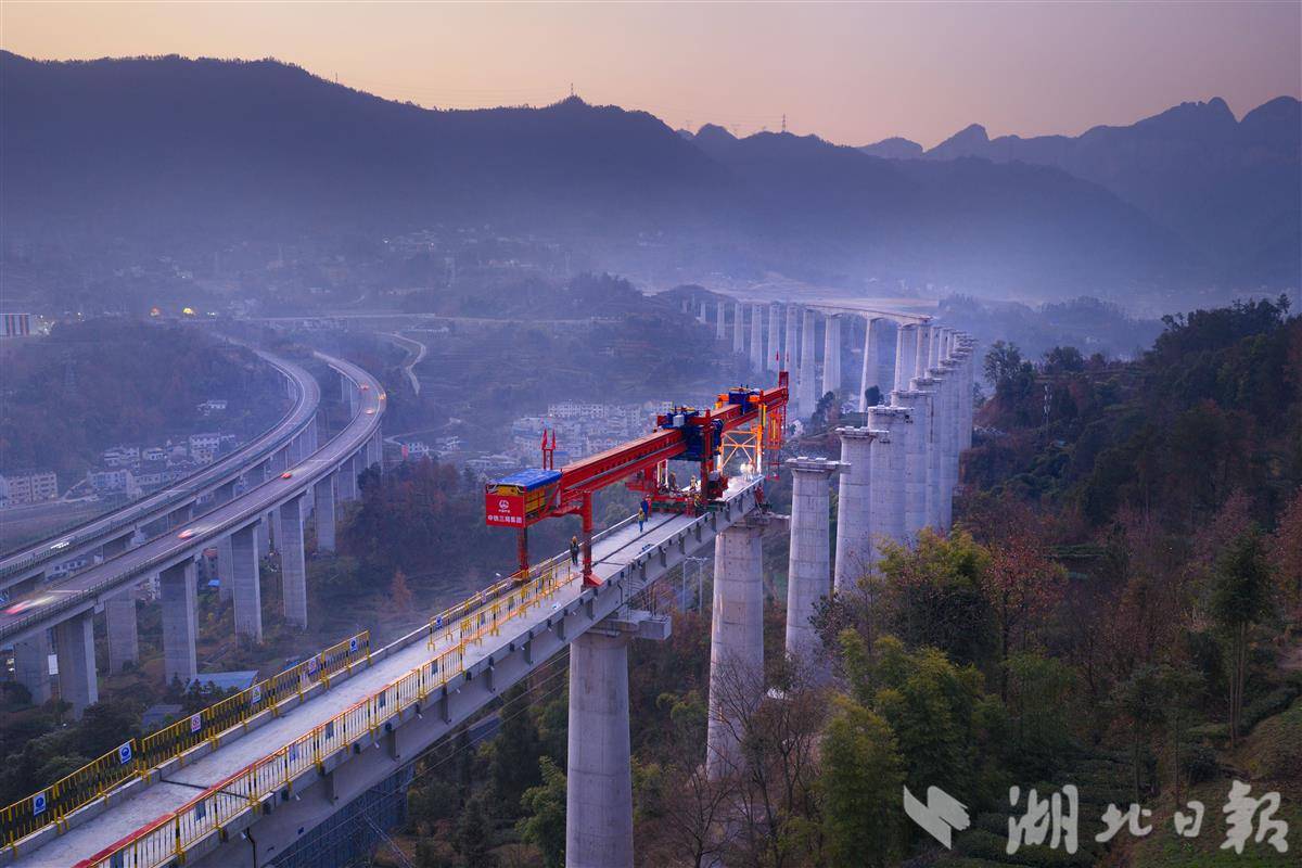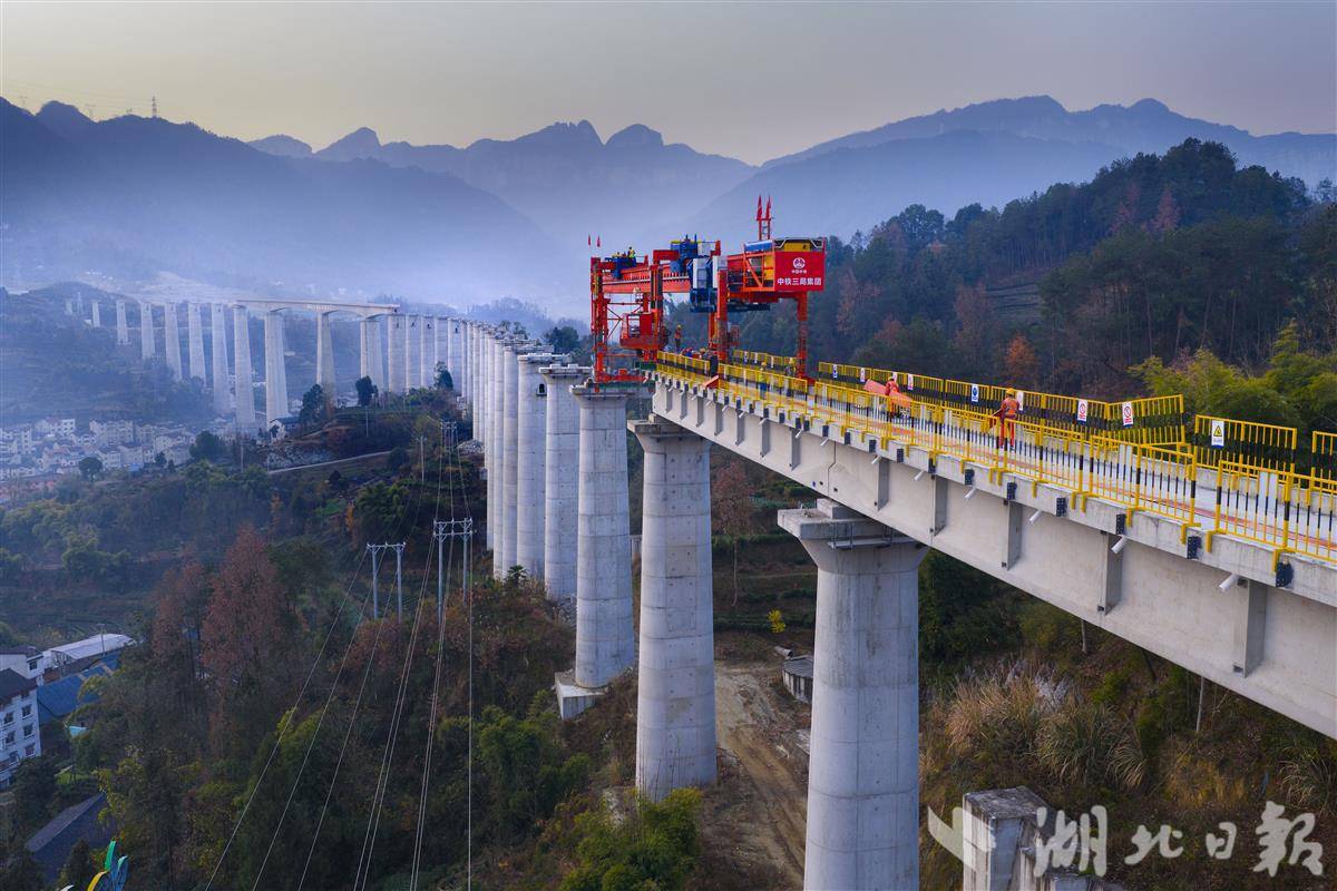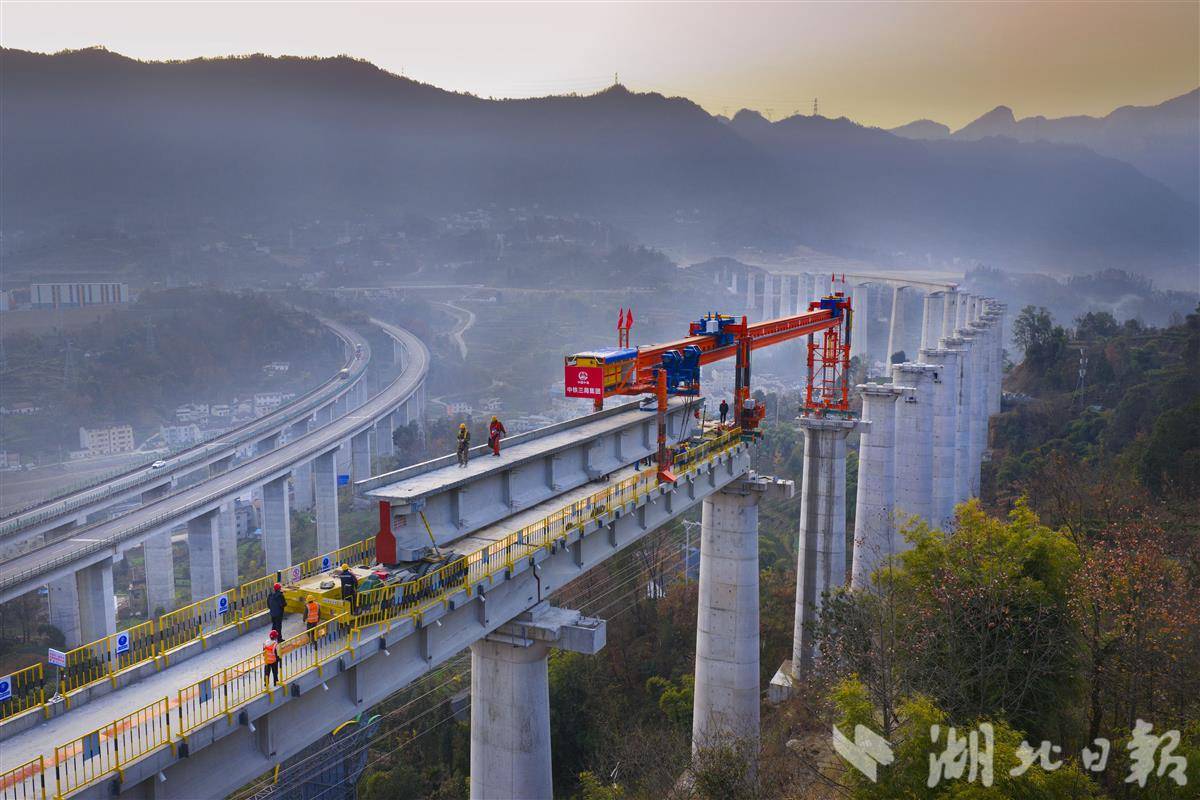 12月26日,三峡枢纽茅坪港疏港铁路九里特大桥T型梁架设工地一派繁忙。