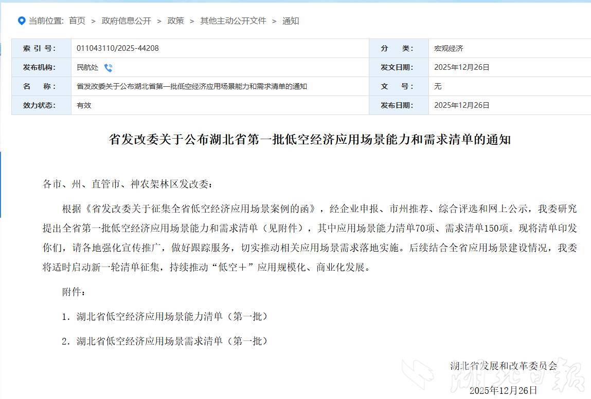 湖北日报讯(记者谢慧敏)12月26日,省发改委发布全省第一批低空经济应用场景能力和需求两张清单,涵盖“低空+”城市治理、应急救援、交通运输、生产作业、时尚文旅五大类,共计220项。