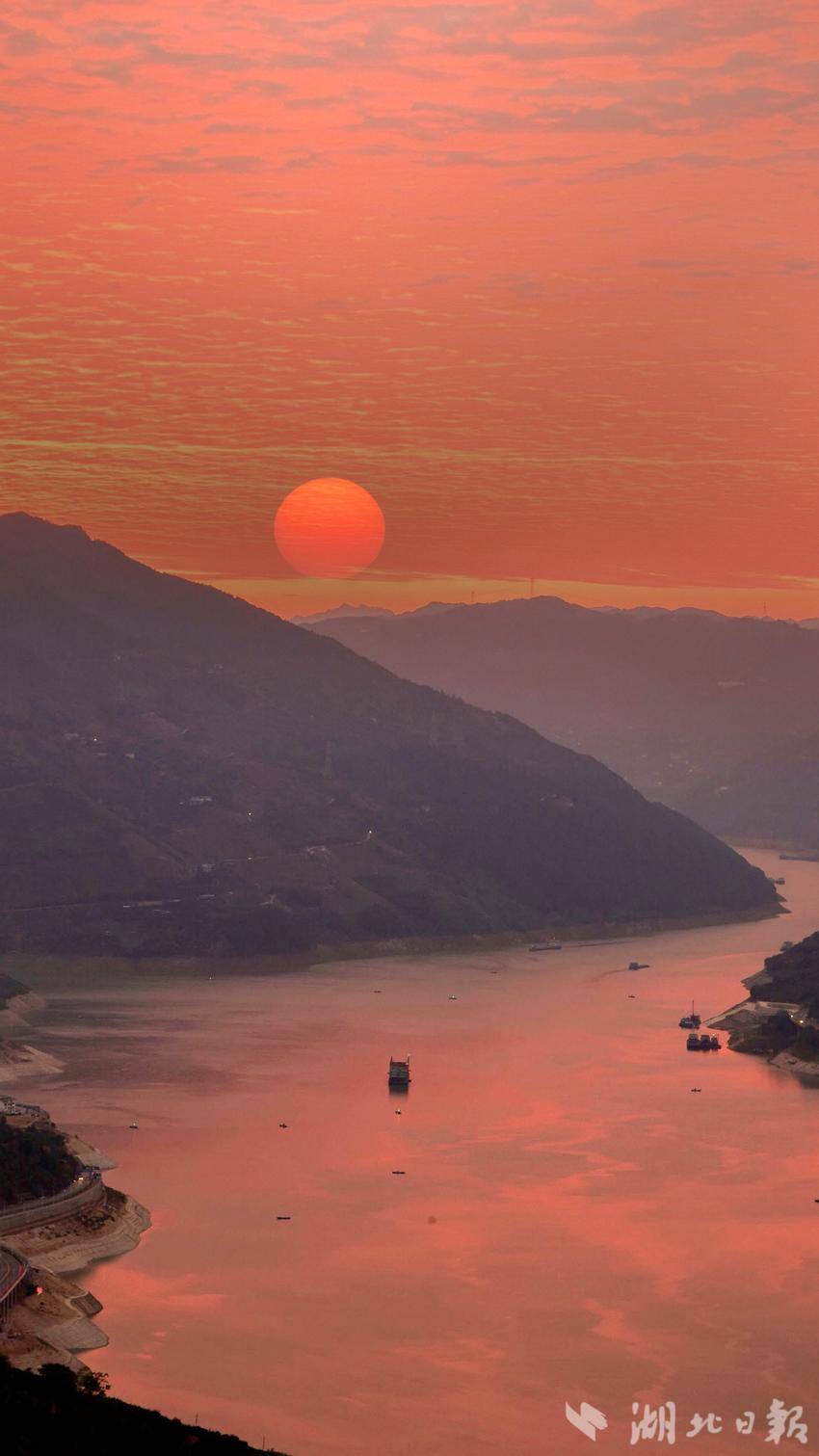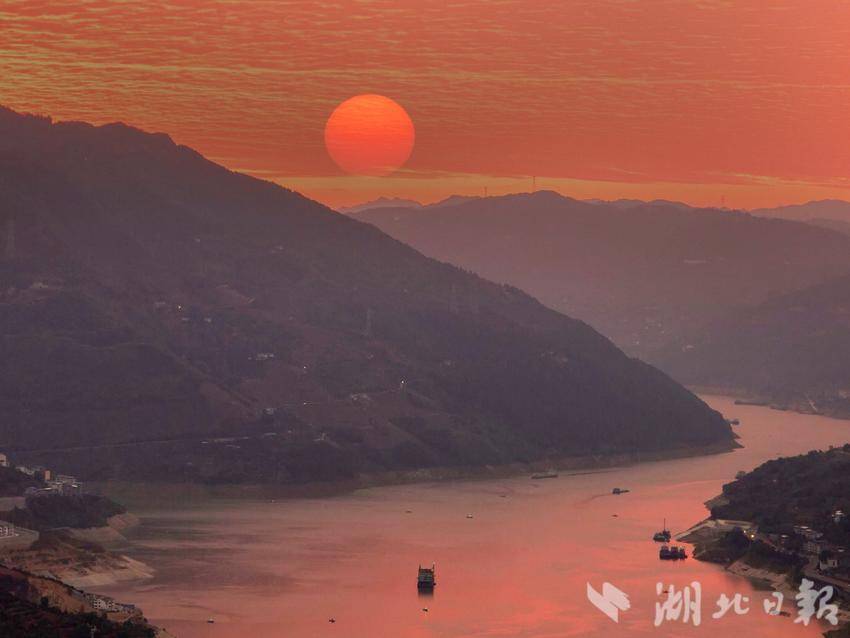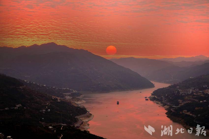 湖北日报客户端讯(通讯员陈功龙)12月26日,久阴初晴的湖北巴东迎来了一场惊艳的日出盛景。晨曦微露时,峡江两岸的群山还沉浸在朦胧的黛色中,而东方天际已悄然晕开层层橘红,将长江巴东段的江面染成了温润的胭脂色。