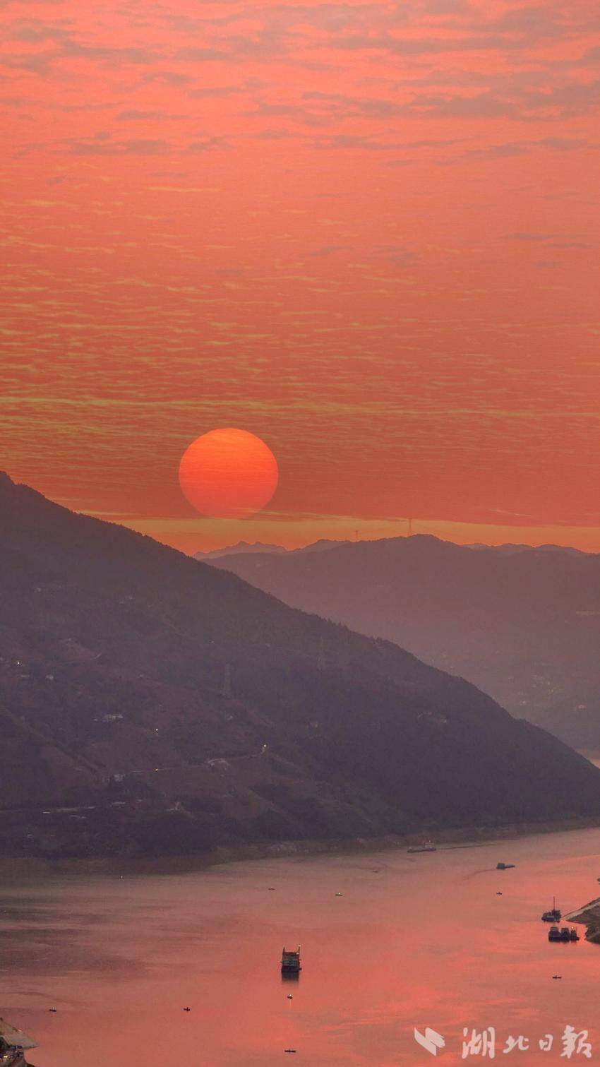 一轮浑圆的红日从连绵的山峦后缓缓升起,炽热的红芒穿透晨雾,为陡峭的山壁镀上金边,也让江面的粼粼波光化作跳跃的金红。江面上,几艘货轮静静航行,船影与红日、青山相映成趣,勾勒出一幅动静相融的峡江日出图。