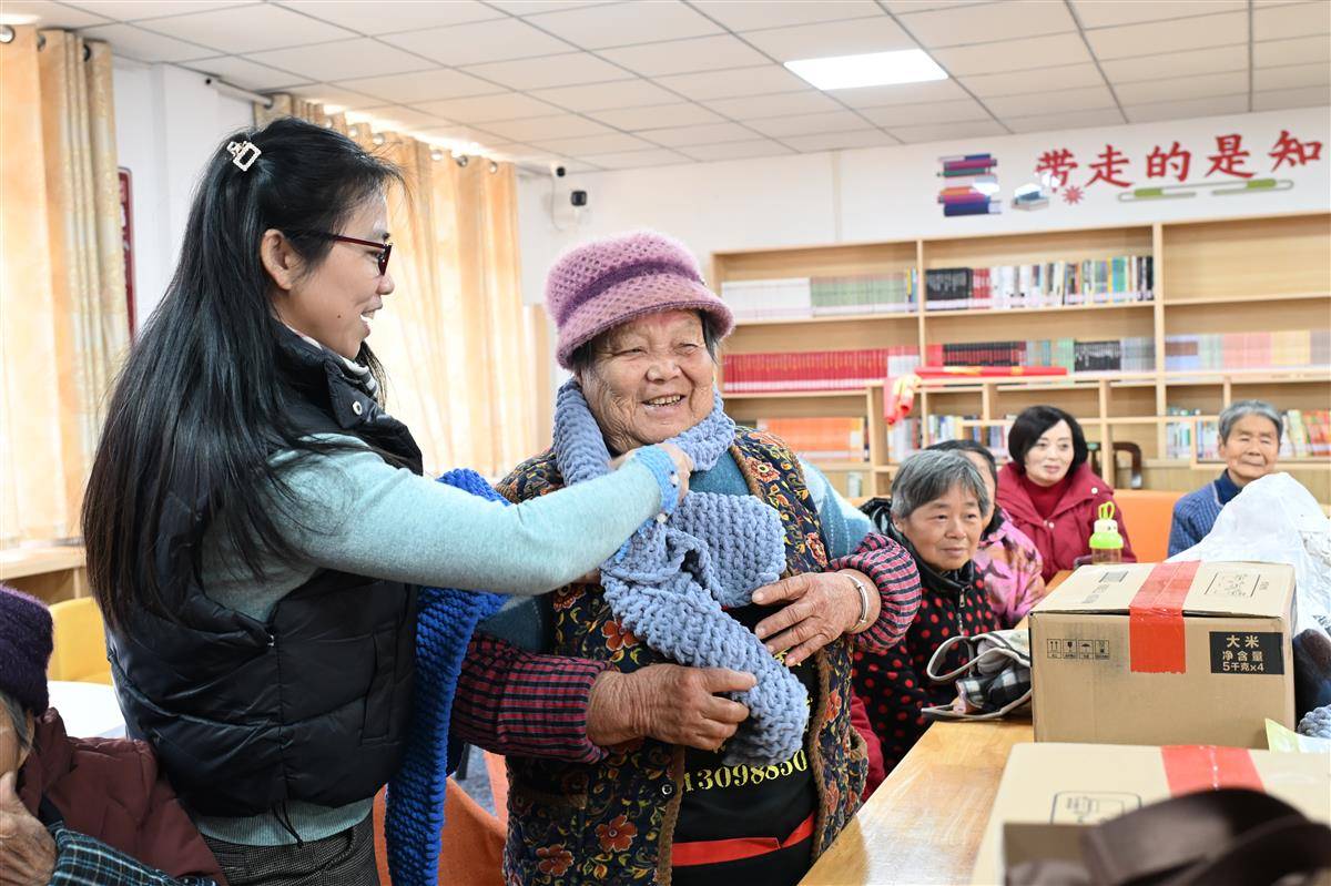 在潘塘街社区养老服务中心,志愿者们为老人送上保暖衣服和米、油等物资,拉着他们的手促膝谈心,仔细询问他们的饮食起居、身体状况和生活需求,叮嘱老人们注意防寒保暖,现场氛围温馨又热闹。