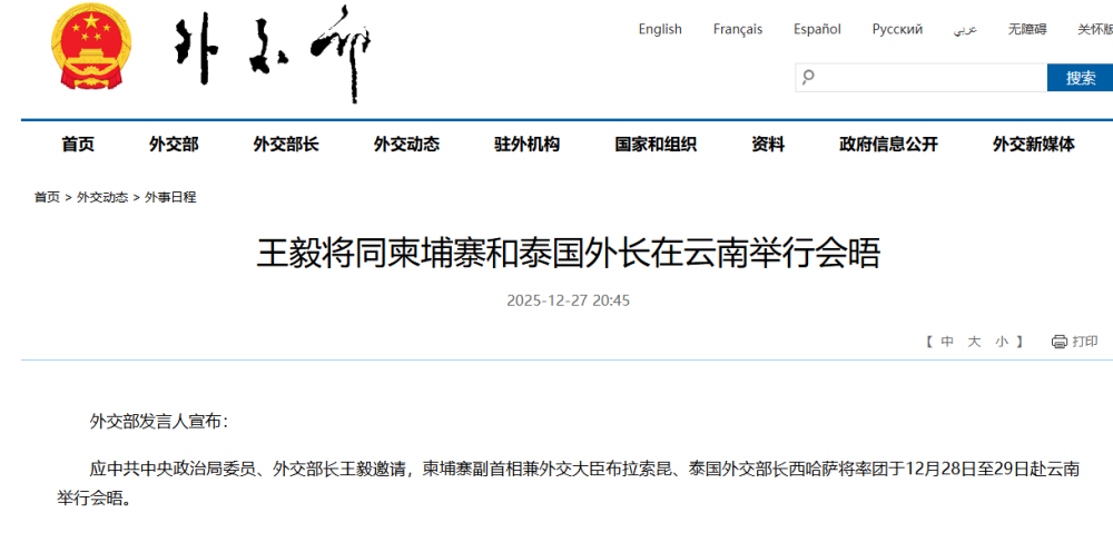 应中共中央政治局委员、外交部长王毅邀请,柬埔寨副首相兼外交大臣布拉索昆、泰国外交部长西哈萨将率团于12月28日至29日赴云南举行会晤。