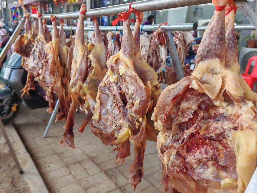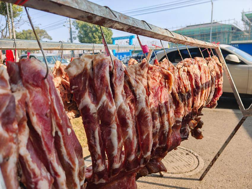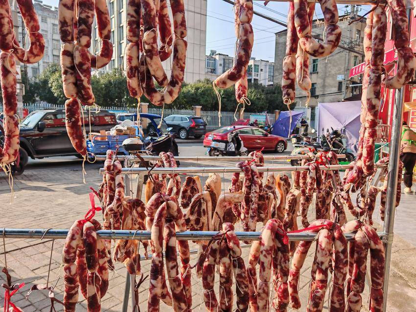 晾晒腊味,是云梦县城乡居民代代相传的习俗。从寻常百姓家到街头巷尾的餐饮酒店,人们都遵循着这一传统,将新鲜食材经过盐渍、香料等腌制后,再借助晴好天气自然风干。阳光下,一串串腊货泛着油润的光泽,空气中弥漫着诱人的咸香,不仅为寒冬增添了烟火气,更让年味在腊香中悄然酝酿。
