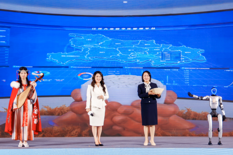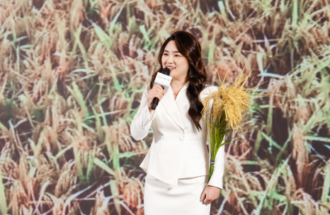 图为推介官向红新携稻穗登台解读江汉大米“长粒、优质、好吃”的核心品质密码。