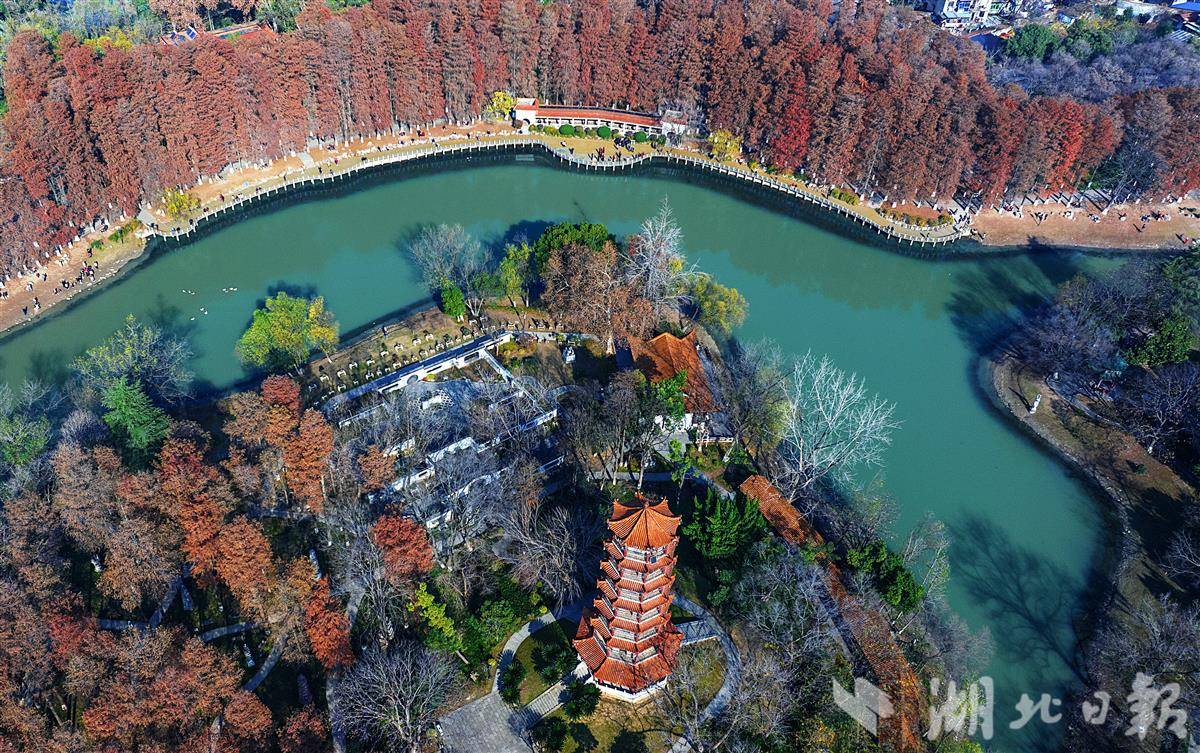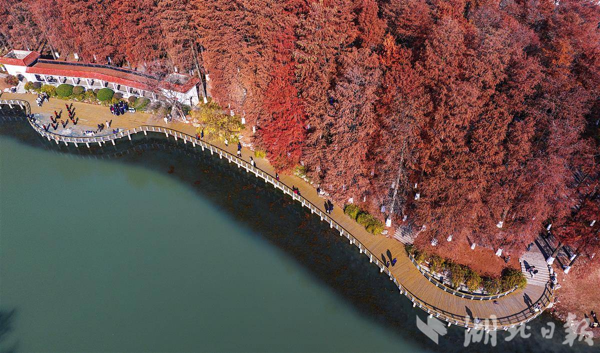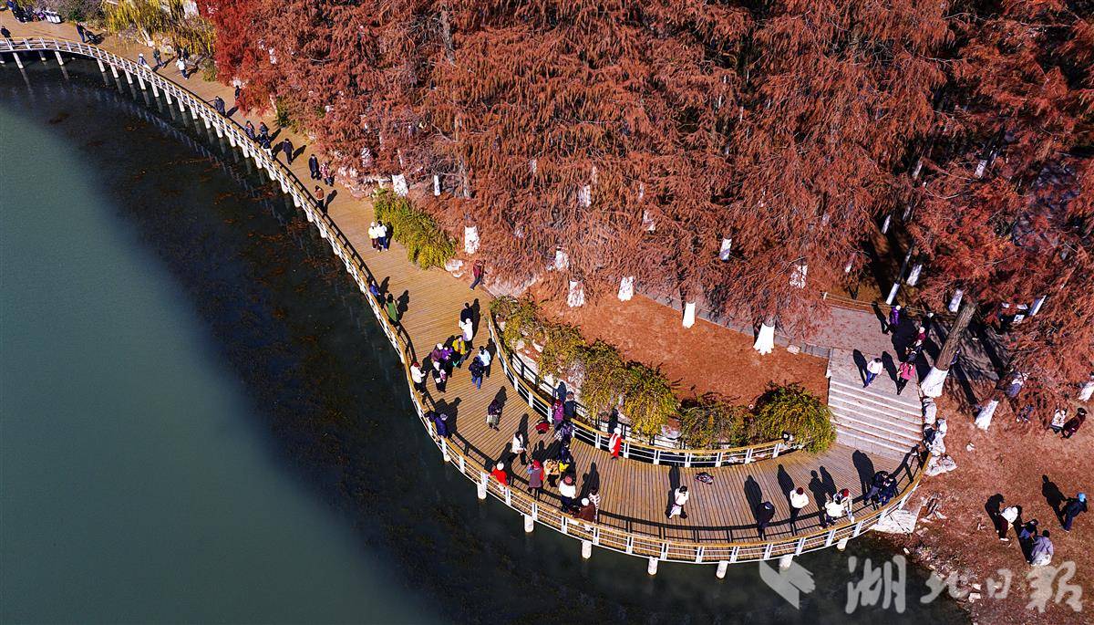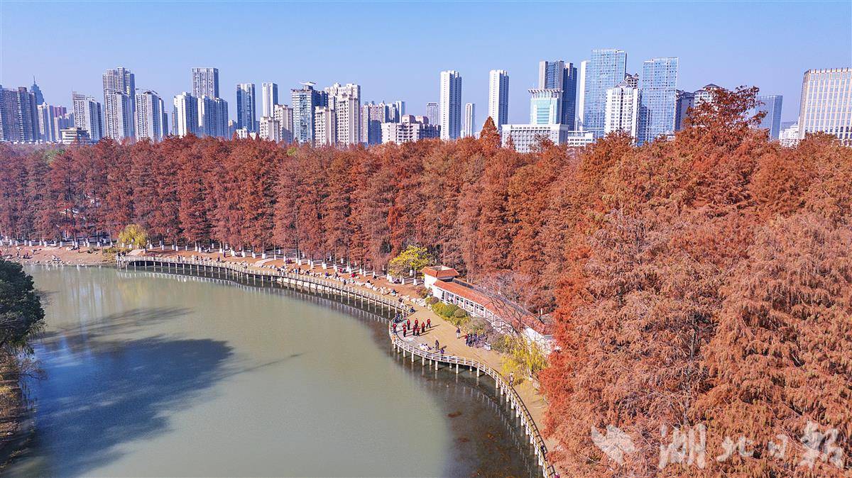 12月26日,解放公园冬景美如画,湖边挺拔的池杉林的红棕色绚丽而浓烈,阳光穿过疏朗的枝丫,洒下慵懒温柔的光辉。市民们纷纷来此享受暖阳,孩童的欢笑、悠然的步履,都为这幅冬日画卷注入了温暖的生机。(湖北日报全媒记者 朱熙勇 摄)