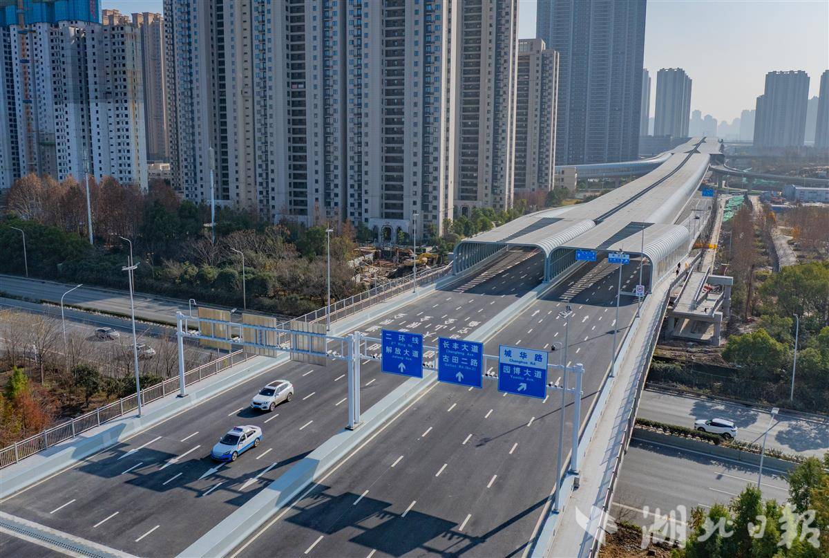 12月28日,武汉古田一路北段正式通车。古田一路北段南起硚口区长云路,北至东西湖区金银湖南街,全长约2.79公里,采用“主线高架+地面辅道”的双层设计,主线高架设计时速可达80公里,有效衔接长丰大道、三环线等快速路网。硚口区与东西湖区之间的通行时间从30分钟缩短至3分钟以内,惠及沿线约22万居民。(湖北日报全媒记者 柯皓 摄)