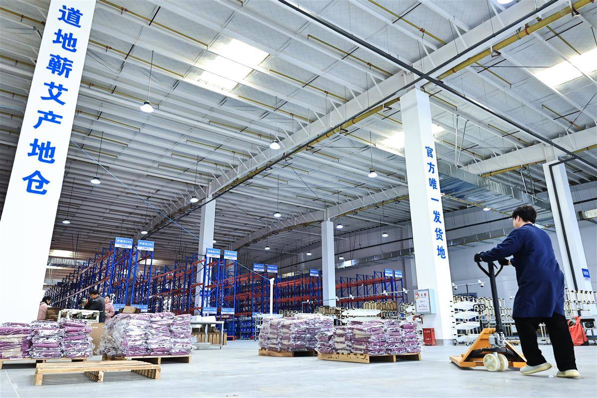 12月11日,在蕲春县蕲艾数智云仓——投资3.5亿元、占地200亩的智能物流枢纽内,高耸的货架间艾产品整齐码放,空气中弥漫着特有的草本清香。